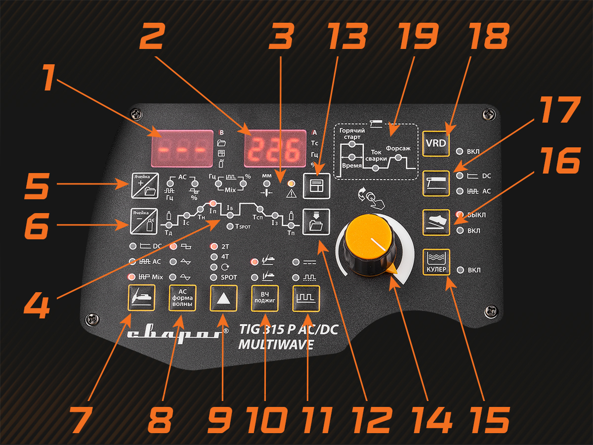 1 – Индикатор параметров: Напряжение на дуге, Предустановленные режимы сварки или ячейки памяти, Сохранение режима сварки, Продувка газом