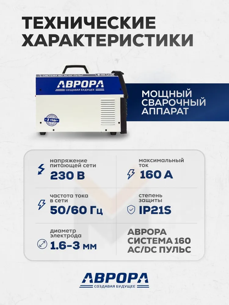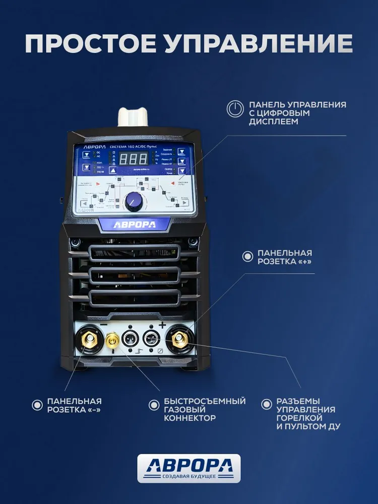 Аппарат АВРОРА Система 160 AC/DC ПУЛЬС — это профессиональное оборудование для импульсной сварки как постоянным (TIG DC), так и переменным током (TIG AC). Оно также подходит для классической сварки покрытым электродом (MMA). Аппарат обладает всеми необходимыми настройками, позволяющими добиться высочайшего качества сварки алюминия, стали, нержавеющей стали и прочих цветных металлов. Удобная циклограмма, знакомая каждому сварщику, позволяет отдельно настроить режим ПУЛЬС и регулировать каждую стадию сварочного процесса, что делает аппарат универсальным инструментом для решения самых разных сварочных задач.