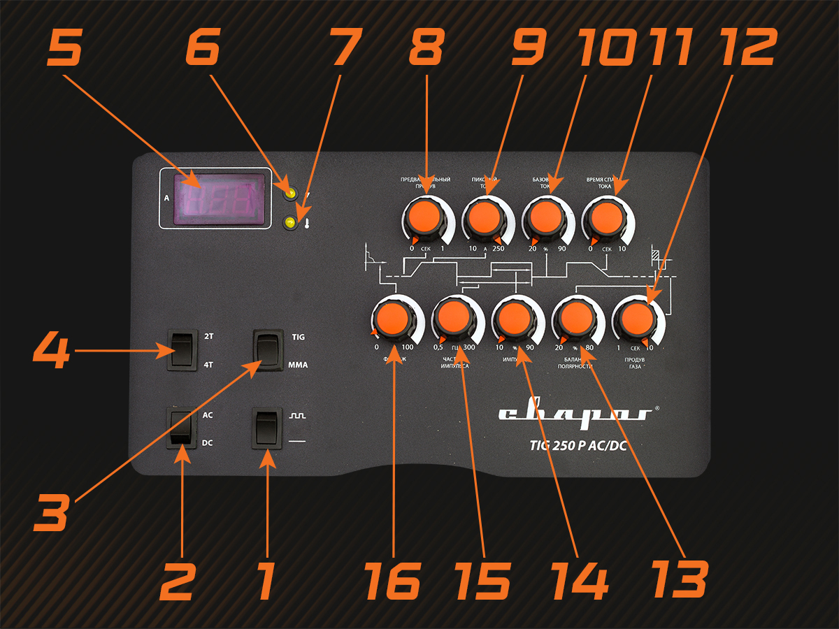 Аппарат TECH TIG 250 P AC/DC (E102) имеет удобную систему управления