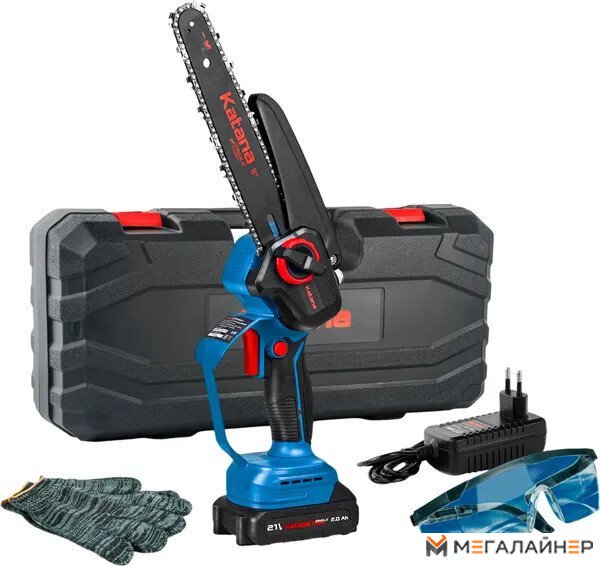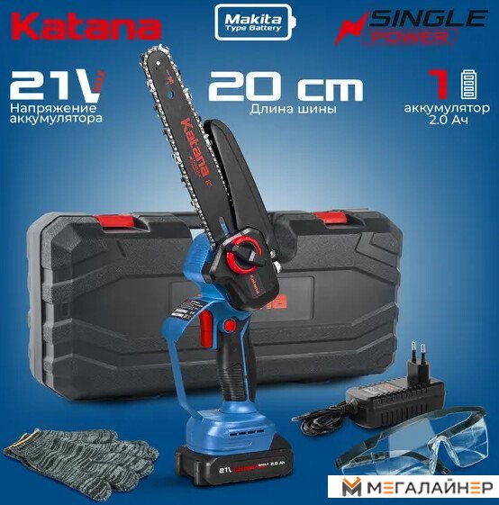 | Комплект поставки | 1. Пила цепная аккумуляторная KATANA – 1 шт. 2. Пильная шина – 1 шт. 3. Цепь пильная – 1 шт. (для моделей AP3208, AP3208-1, AP3210PRO, AP3210PRO-1 – 2 шт.) 4. Инструкция по эксплуатации с гарантийным талоном – 1 шт. 5. Пластиковый кейс – 1 шт. 6. Зарядное устройство – 1 шт. 7. Аккумуляторная батарея. |