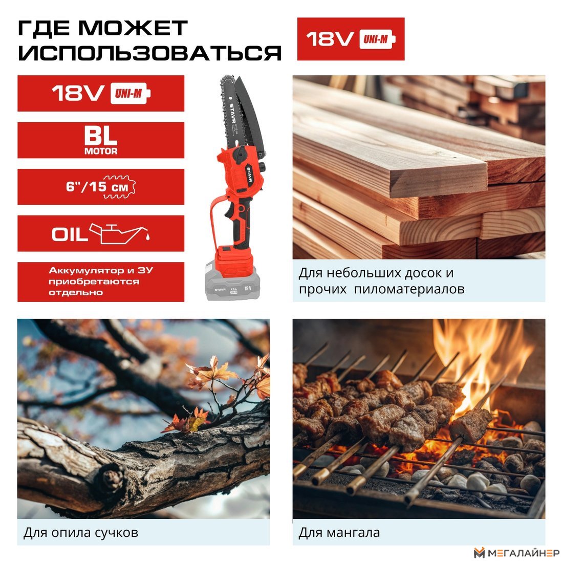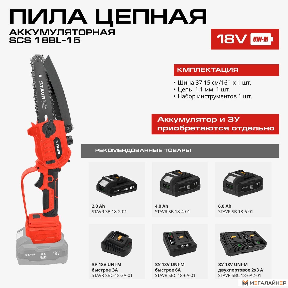 | Информация | - Цепная аккумуляторная пила STAVR SCS 18BL-15 — отличный выбор для вашего сада. - Оснащенная бесщеточным двигателем, пила обеспечивает высокую производительность, экономное потребление заряда и длительный срок службы. Шина длиной 15 см и скорость цепи 7 м/с позволяют легко справляться с различными задачами. Бесключевое натяжение цепи делает настройку простой, а автоматическая смазка и регулируемая подача масла гарантируют бесперебойную работу. - Легкий вес в 1,1 кг и функция защиты от случайного включения повышают удобство и безопасность использования. Пила STAVR SCS 18BL-15 совместима с аккумуляторной платформой 18V UNI-M, что позволяет использовать один аккумулятор с более чем 500 инструментами и садовой техникой. Это значительно экономит время и деньги на покупку дополнительных батарей. - Выбирая эту пилу, вы получаете надежный, производительный и удобный инструмент, который идеально подходит для работы в саду и на приусадебном участке. |