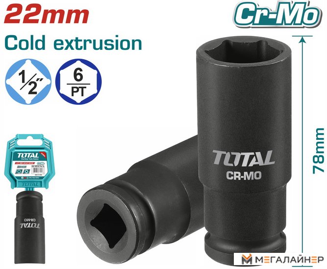 | Комплектация | Торцевая головка удлиненная ударная 1/2" 24 мм TOTAL THDIS12241L - 1 шт. |