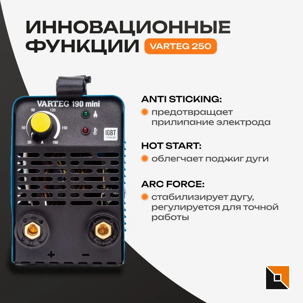 - Встроенные функции оптимизации и облегчения процесса сварки: Hot Start (горячий старт), Arc Force (форсаж дуги), Anti-Sticking (антизалипание)