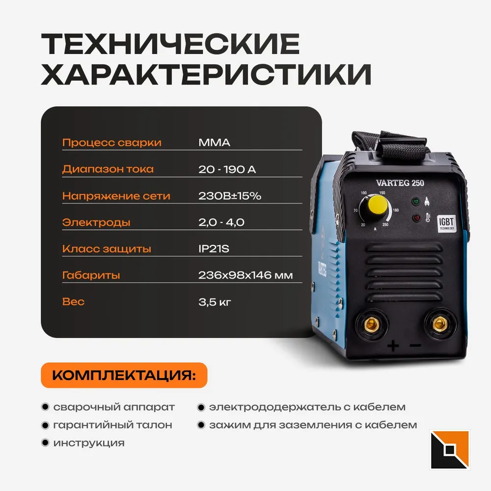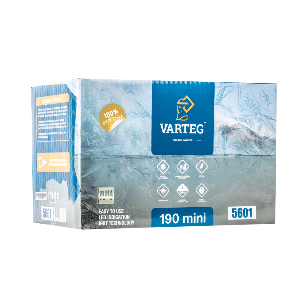 Сварочный аппарат Foxweld Varteg 190 мини предназначен для ручной дуговой сварки штучным покрытым электродом на постоянном токе. Varteg 190 мини выполнен по новейшей IGBT технологии, позволяющей добиться минимального веса и габаритов. Аппарат позволяет получать сварные швы высокого качества и отличается малым разбрызгиванием металла за счет встроенных функций (Hot-Start, Arc-Force и AntiSticking), которые позволяют оптимизировать и облегчить процессы сварки. Защита от перегрева исключает выход из строя инвертора при долгом использовании. Инвертор прост в управлении и не требует специального технического обслуживания. Varteg 190 мини отличается надежностью, хорошими техническими характеристиками, устойчиво работает при понижении напряжении сети (даже от 140 В), что делает инвертор более универсальным и практичным. Область применения: в бытовых условиях (на даче, в гараже), а также в небольших мастерских.
