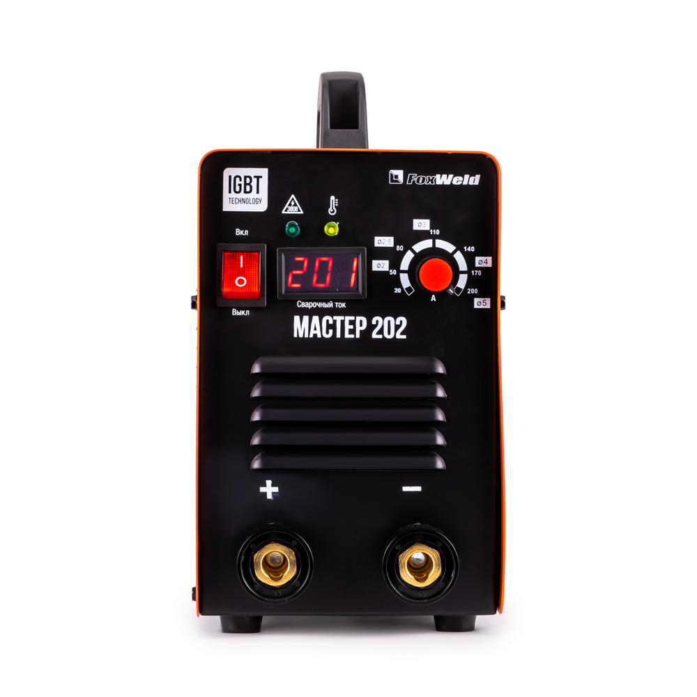 Сварочный аппарат инверторного типа FOXWELD МАСТЕР 202 разработан и сделан для профессионалов, главные особенности - мощность, надежность, компактность. МАСТЕР 202 выполнен для реализации исключительно одного процесса сварки: электродуговая сварка покрытым электродом (MMA). Улучшенная схема стабилизации сварочного процесса дает хороший поджиг и «мягкую» сварочную дугу с минимальным разбрызгиванием. Для облегчения процесса сварки в режиме ММА и получения более качественного сварного соединения, аппарат имеет встроенные функции: AntiSticking (антиприваривание), Arc Force (форсаж дуги) и Hot Start (горячий старт). Модель отличается простой панелью управления и возможностью работать при пониженном напряжении. Вся мощность сварочного тока передаётся от инвертора к сварочным розеткам (байонетам) через медные шины большого сечения. Розетки имеют большой размер 35-50, что также положительно сказывается на передаче полной мощности и долговечности мест соединения: кабельная розетка – кабельная вилка.