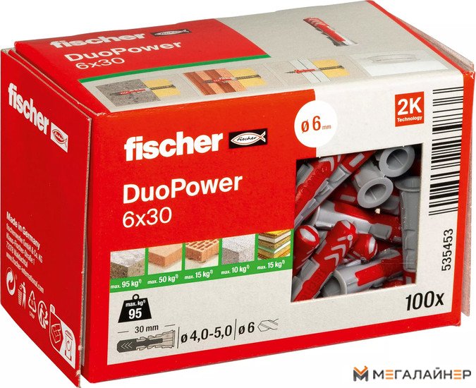 | Информация | ? Fischer DuoPower 6 x 30 535453 - универсальный дюбель, обеспечивающий высокую эффективность крепления. ? Надежное функционирование в различных строительных материалах: полнотелых, пустотелых и листовых. ? Простота монтажа благодаря кромке, предотвращающей проскальзывание в отверстии. ? Отклик дюбеля при монтаже гарантирует правильную установку. |