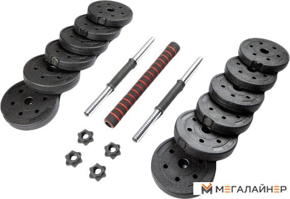 | Комплектация | - 2 гантельных грифа 40 см с гайками - диски 1.25 кг – 4 шт (диаметр 17.5 см, толщина 2.7 см), - диски 1.5 кг – 4 шт (диаметр 18 см, толщина 3 см), - диски 2 кг – 4 шт (диаметр 19.5 см, толщина 3.5 см), - соединительный гриф 40 см для превращения гантелей в штангу (прямой соединительный коннектор). |