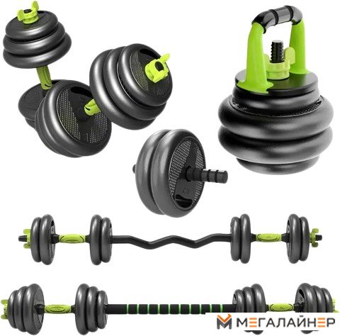 | Комплектация | - 2 грифа прямых 48 см - 1 гриф прямой 40 см - 1 гриф W-образный 60 см - 4 диска по 1.25 кг - 4 диска по 1.5 кг - 4 диска по 2 кг - 1 соединительный гриф - 2 ручки для составления гирь - 4 замка |