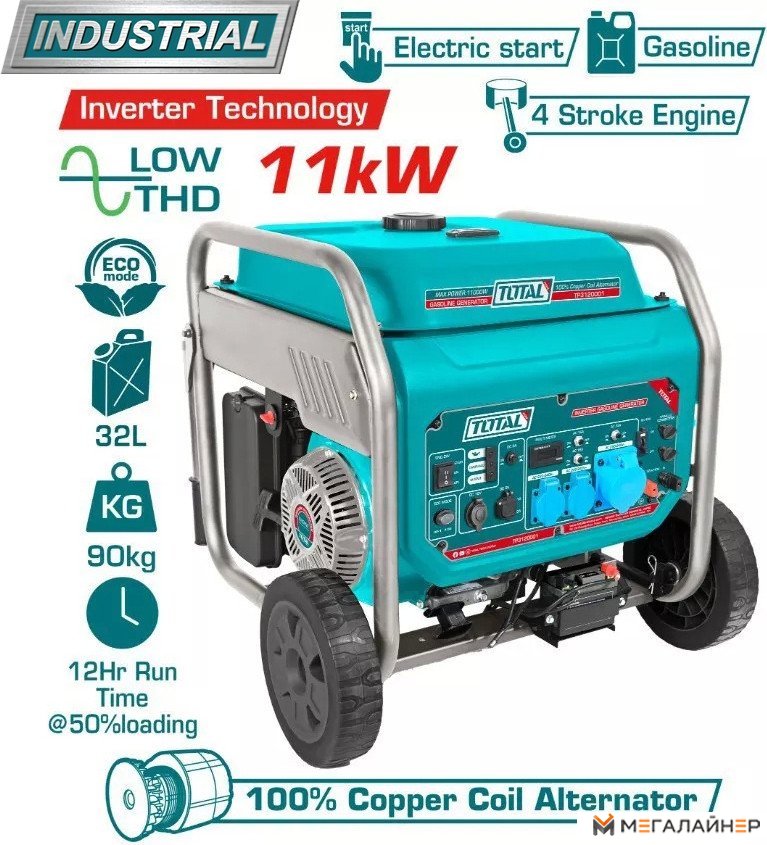 | Информация | TOTAL TP3120001 – бензиновый инверторный генератор для интенсивного использования (industrial) Высокая нагрузочная способность для генераторов такого типа среди конкурентов (10 kW номин. мощность) 2 типа стартера – ручной и электрический Надежный бензиновый 4-х тактный двигатель увеличенного объема для высокой надежности (550 см.куб) Большой объем бака для топлива(32л с индикатором уровня) для высокого показателя автономности работы -до 12 часов непрерывной работы (при 50% загрузке)) 2 режима работы Standard/ Eco – для экономии топлива Полностью медная обмотка альтернатора (генератора) – высокая надежность, в сравнении с алюминиевой Микропроцессорное управление модулем инвертора – чистая синусоида на выходе, не зависимо от нагрузки, возможность подключать сложную электронику для ее стабильной работы, в сравнении с традиционными электростанциями с системой AVR Цифровой дисплей отображает основные параметры Выходные цепи защищены автоматическими выключателями Компактные размеры генератора Усиленная рама Транспортный комплект уже установлен на раме |