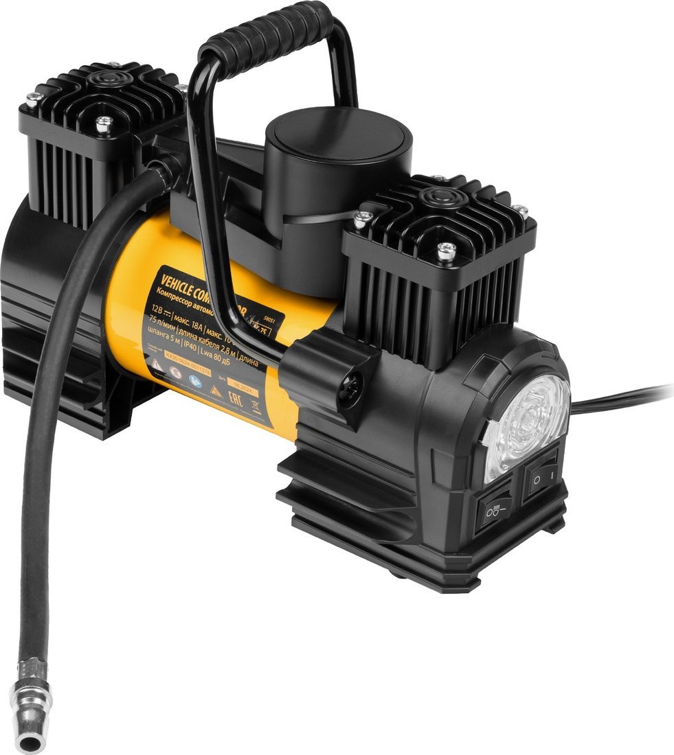 | Информация | Автомобильный двухпоршневой компрессор Denzel AC-75 58051 производительностью 75 л/мин, с LED-фонарем, работает от сети 12 В, поддерживает давление 10 атм. и предназначен для быстрой и эффективной накачки шин, резиновых матрацев и других надувных предметов. Для этого в комплект поставки входит 3 насадки. Компрессор подключается к автомобильному аккумулятору при помощи клемм. Благодаря двухпоршневой конструкции отличается высокой производительностью — накачка шины R16 занимает не более 3-4 минут. Станет незаменимым помощником в поездке и на отдыхе. Преимущества Контроль давления — производитель предусмотрел точный аналоговый манометр. Безопасная работа — автомобильный предохранитель защищает бортовую сеть от перегрузок. Хорошее освещение — LED-фонарь позволяет использовать инструмент в темное время суток и помещениях с нехваткой света. Устойчивость — нескользящие ножки позволяют установить компрессор на любой поверхности. Эргономичность и мобильность — устройство снабжено удобной рукояткой. Мобильность — воздушный шланг длиной 5 м позволяет свободно перемещаться по рабочей зоне. Удобное хранение и транспортировка — компрессор поставляется в прочной сумке. |