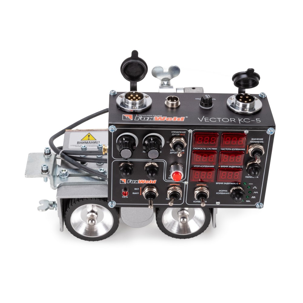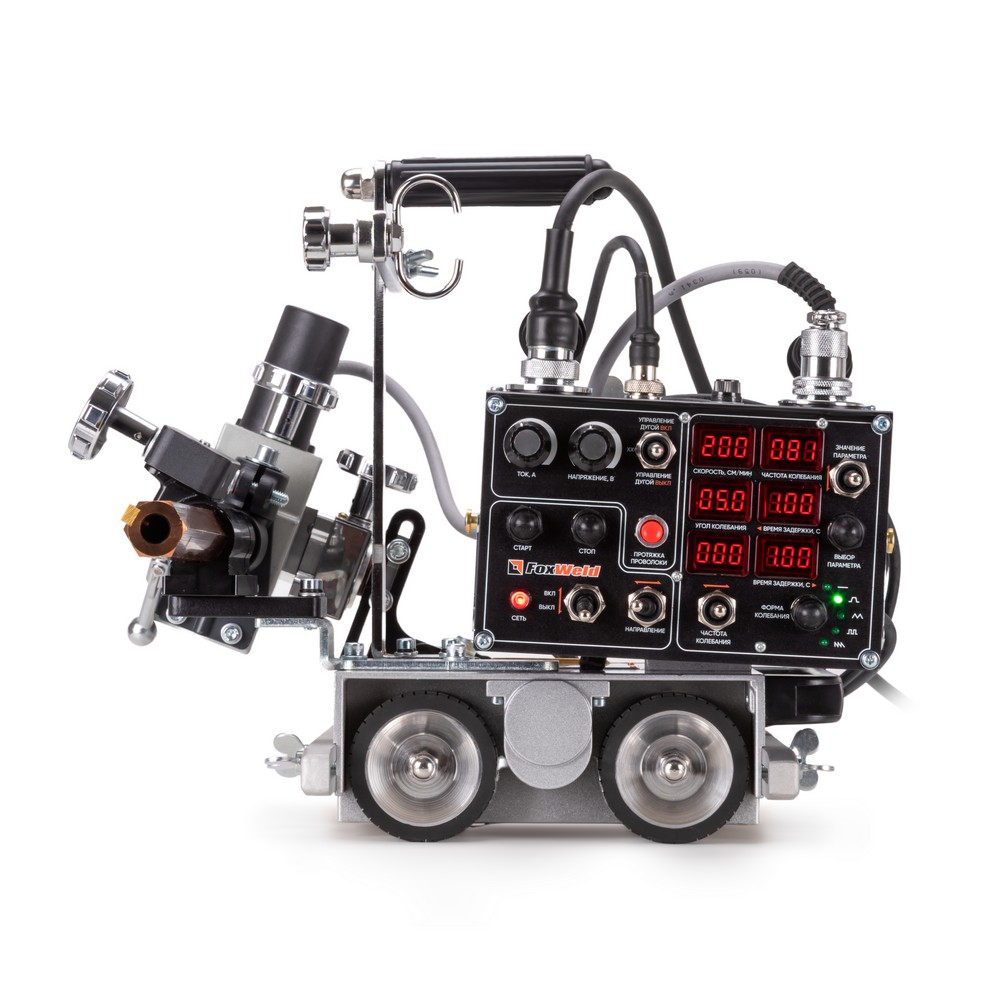 6 цифровых дисплеев отображают значения параметров настройки каретки. На панели управления также расположены индикатор питания, ручки регулировки сварочного тока и напряжения, переключатели холостого хода, направления и значения параметров, частоты колебаний, а также кнопки протяжки проволоки, выбора параметра и формы колебаний.
