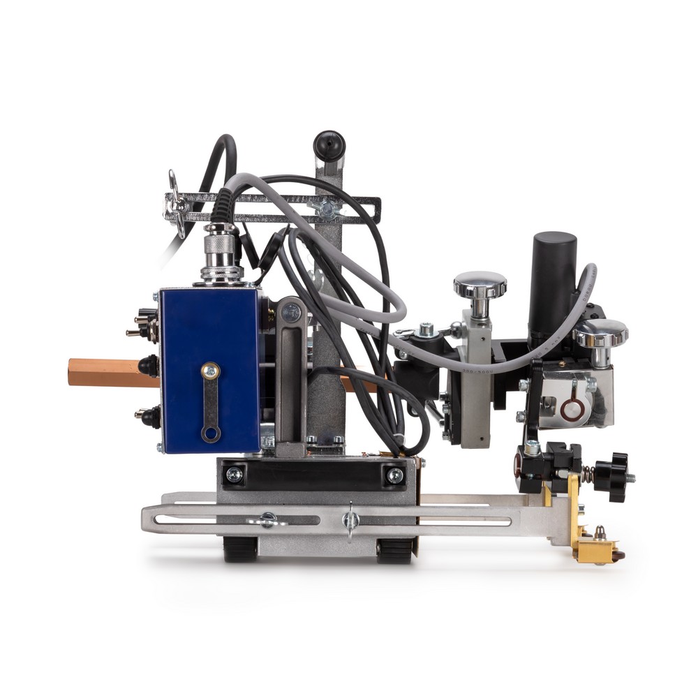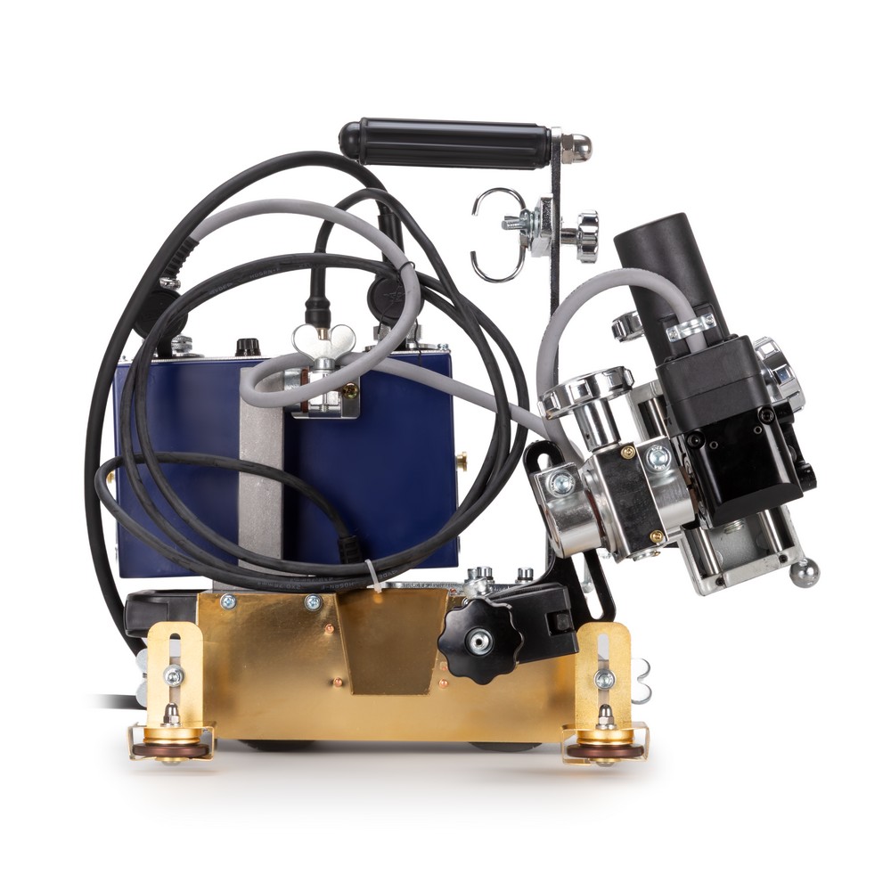 Нижняя часть сварочной каретки оборудована мощным магнитом и 4мя полноприводными колёсами, что позволяет производить сварочный процесс не только в горизонтальном, но и в вертикальном положении. Минимальная толщина металла для вертикальной сварки – 6 мм.