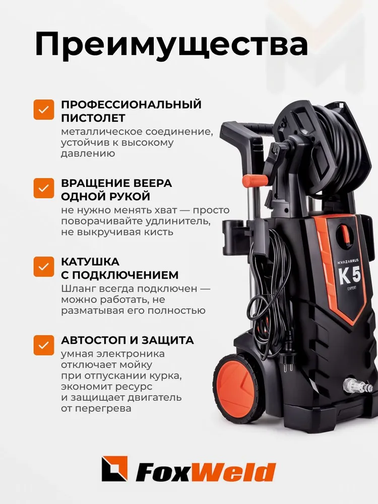 Мойка высокого давления KVAZARRUS K5 Expert сетевая - предназначена для мойки теплиц, парников, окон и стен загородного дома, придомовой территории, более крупного автомобиля и других подобных работ.
