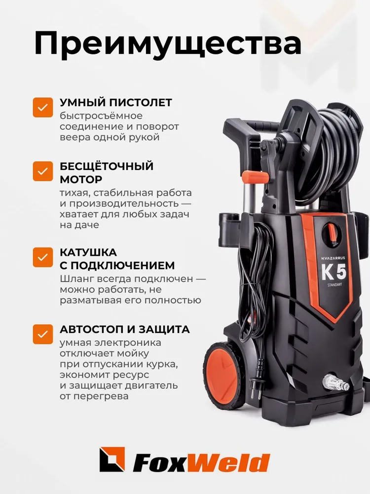 Мойка высокого давления KVAZARRUS K5 Standart сетевая - предназначена для мойки теплиц, парников, окон и стен загородного дома, придомовой территории, среднего автомобиля и других подобных работ.