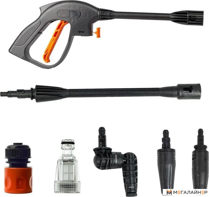 | Комплектация | 1. Корпус мойки высокого давления 2. Ручка для перемещения 3. Держатель моечного пистолета 4. Колёса 5. Пеногенератор 6. Моечный пистолет 7. Насадка-удлинитель для пистолета 8. Шланг высокого давления для воды 9. Универсальная моечная фреза 10. Быстросъёмные коннекторы для шланга 11. Грязевая фреза 12. Угловая фреза |