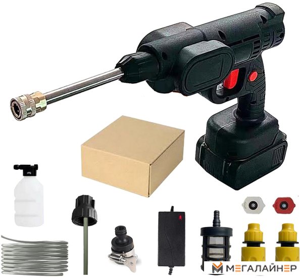 Пистолет - 1 шт.; Аккумулятор Li-Ion - 1 шт.; Металлическая штанга - 1 шт.; Шланг - 1 шт.; Коннектор для шланга - 1шт.; Штуцер для садового полива - 1шт.; Фильтр для шланга - 1 шт .; Зарядное устройство - 1 шт.; Насадка-рас
