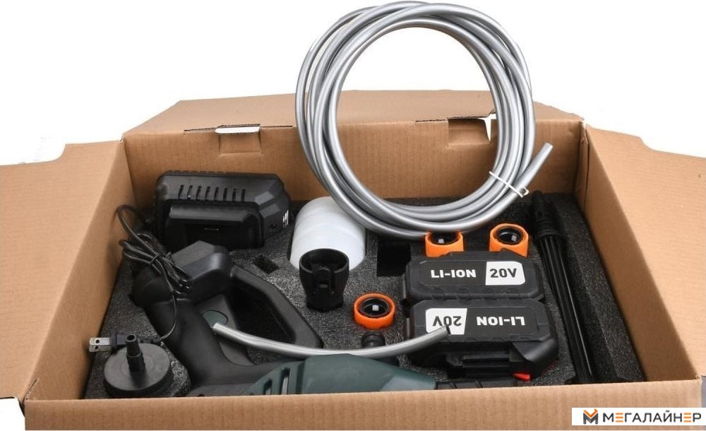 | Комплектация | - Мойка; - Шланг; - Штанга; - Аккумуляторы 4 Ач - 2 шт; - Емкость для моющих средств; - Фильтр; - Коннектор для шланга; - Насадка - 3 шт; - Быстроразъемный соединитель; - Штуцер для садового полива; - Руководство по эксплуатации. |