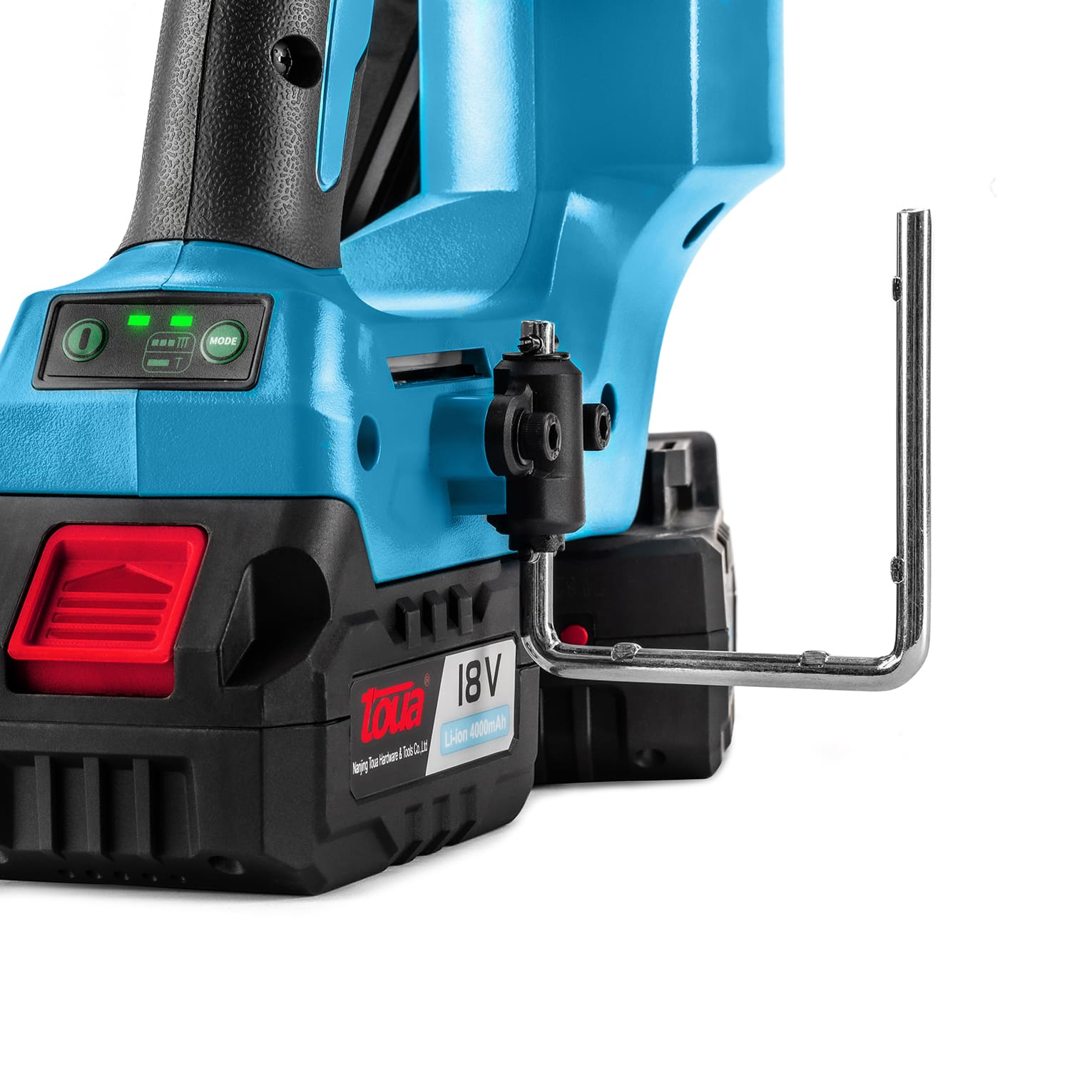 Единственным источником энергии данной модели монтажного пистолета является аккумулятор Toua Li-ion - 18V DC, что делает его более автономным и независимым от других источников энергии. Энергия выстрела инструмента 105 Дж позволяет выполнять широкий спектр работ по дереву. За счет отсутствия механизма подачи газа в инструменте удалось реализовать более мягкий и короткий прижим ствола для его активации, что делает работу более комфортной и нивелирует вес инструмента. Применяется в каркасном домостроении, монтаже OSB, обрешетке и упаковке грузов.