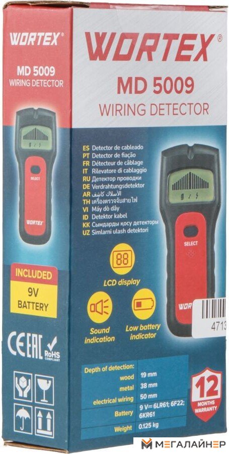 | Комплектация | - Детектор проводки - 1 шт. - Батарея 9 V - 1 шт. - Инструкция по эксплуатации - 1 шт. |