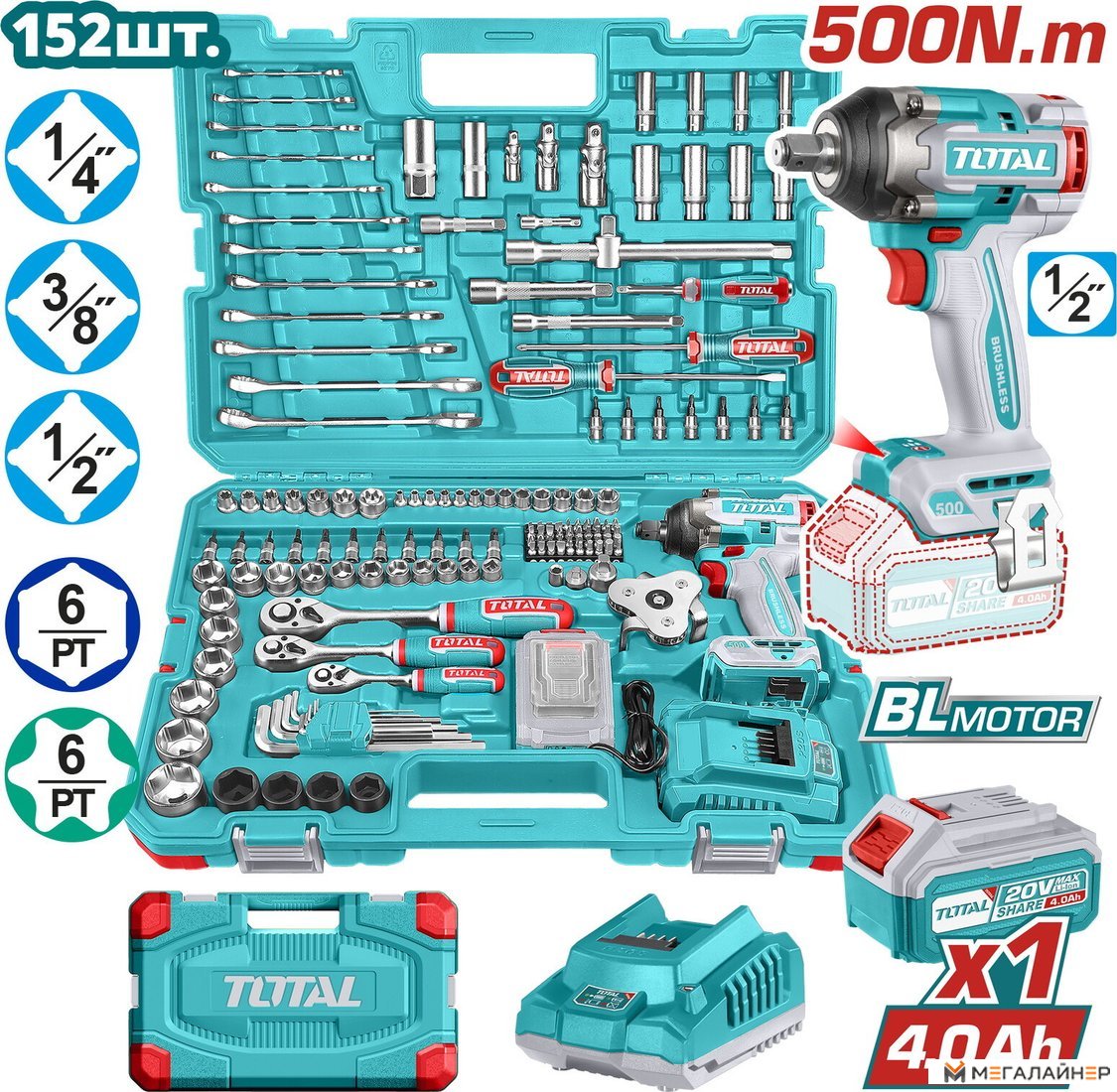 | Комплектация | Гайковерт TOTAL TIWLI2050 - 1 шт. Аккумулятор 4,0 А·ч TFBLI2002 - 1 шт. Зарядное устройство TFCLI2001E - 1 шт. Трещотка 1/4" - 1 шт. Торцевые головки 1/4" (4 / 4,5 / 5 / 5,5 / 6 / 7 / 8 / 9 / 10 / 11 / 12 / 13 / 14) - 13 шт. Головки 1/4"x32(L) с битами: Н3 / H4 / H5 / H6 / H8 / T8 / T10 / T15 / T20 / T25 / T30 / T40 / SL5,5 / SL6,5 / PH2 / PH3 / PZ2 / PZ3 - 18 шт. Глубокие головки 1/4" DR 50 мм(L): 8, 9, 10, 12 мм - 4 шт. Удлинитель 1/4" DR x 50 мм - 1 шт. Вороток: 1/4" x 150 мм - 1 шт. Карданный шарнир 1/4" - 1 шт. Трёхходовой адаптер 1/4"(F) x 1/4"(M) - 1 шт. Держатель бит: 1/4"x6,35 мм - 1 шт. Биты 6,35x25мм (L): T5 / T6 / T7 / T8 / T9 / T10 / T15 / T20 / T25 / T30 / PH1 / PH2 / PH2 / PH3 / PH4 / PZ1 / PZ2 / PZ2 / PZ3 / PZ4 / SL3 / SL3 / SL4 / SL4 / SL5 / SL5.5 / SL6 / SL6.5 / SL7 / SL7 / H2 / H3 / H3 / H4 / H4 / H5 / H5 / H6 / H7 / H7 - 40 шт. Ударные головки 17, 19, 21, 22 мм - 4 шт. Трещотка 1/2" - 1 шт. Карданный шарнир 1/2" - 1 шт. Головки 1/2" (21, 22, 23, 24, 27, 30, 32 мм) - 7 шт. Свечные головки 1/2" (16, 21 мм) - 2 шт. Удлинители: 1/2" (125 мм, 250 мм) - 2 шт. Трёхсторонний адаптер 1/2": 3/8"(M) x 1/2"(F) - 1 шт. Шестигранные головки 3/8" (10, 11, 12, 13, 14, 15, 16, 17, 18, 19 мм) - 10 шт. Глубокие шестигранные головки 3/8" (13, 14, 15, 17 мм) - 4 шт. Звездообразные головки 3/8" (E10, E11, E12, E14, E16, E18, E20) - 7 шт. Вороток 3/8" - 1 шт. Удлинители 3/8" (75 мм, 150 мм) - 2 шт. Карданный шарнир 3/8" - 1 шт. Трёхсторонний адаптер 3/8": 3/8"(F)x3/8"(M) - 1 шт. Ключ для масляного фильтра - 1 шт. Отвёртки: SL6.5x150, PH2x150 - 2 шт. комбинированные ключи 6, 8, 9, 10, 11, 12, 13, 14, 15, 17, 18, 19 - 12 шт. Ключи Torx T10, T15, T20, T25, T27, T30, T40, T45, T50 - 9 шт. Кейс |