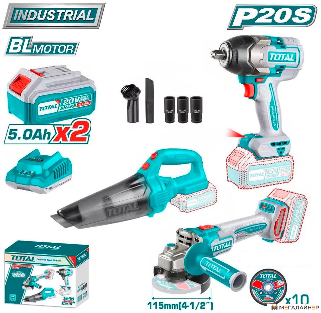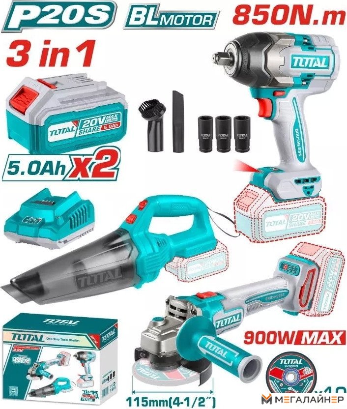 | Комплектация | - Гайковерт TOTAL TIWLI20851 - 1 шт. - Угловая шлифмашина TOTAL TAGLI21154 - 1 шт. - Пылесос TOTAL TVLI201261 - 1 шт. - Аккумулятор TFBLI20531 5,0 Ач - 2 шт. - Зарядное устройство TFCLI2001 - 1 шт. - Торцевые головки (22, 24, 27 мм) - 3 шт. - Отрезные диски по металлу - 10 шт. - Щелевая насадка - 1 шт. - Щетка для пыли с мягкой щетиной - 1 шт. - Коробка. |