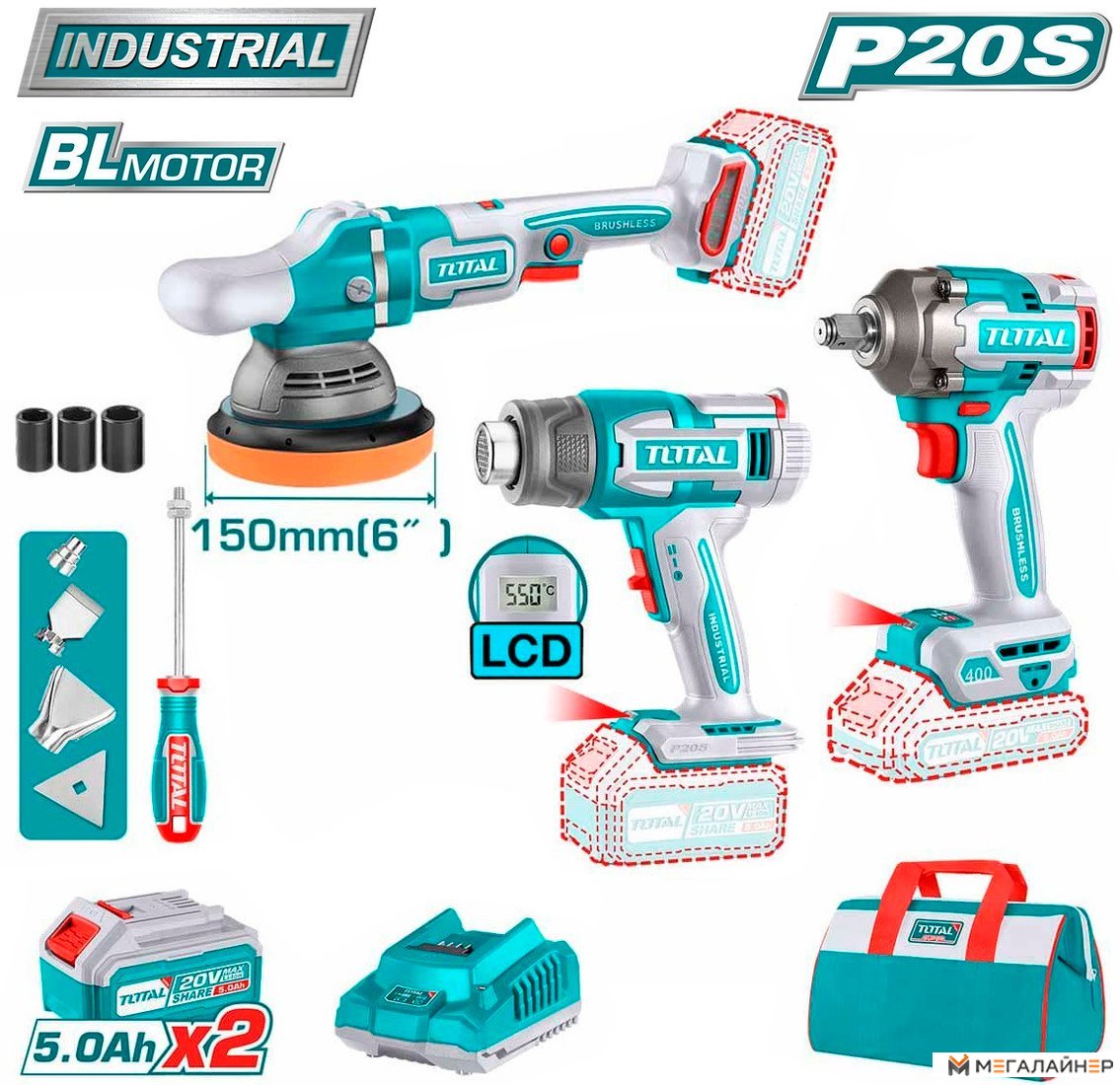 | Комплектация | - Гайковерт TIWLI20401 - 1 шт. - Полировальная машина TOTAL TAPLI20151 - 1 шт. - Фен строительный TOTAL TBLI2003 - 1 шт. - Аккумулятор TFBLI20531 5,0 Ач - 2 шт. - Зарядное устройство TFCLI2001 - 1 шт. - Насадка для фена - 3 шт. - Торцевые головки (17, 19, 21 мм) - 3 шт. - Полировальная насадка - 1 шт. - Сумка. - Коробка. |