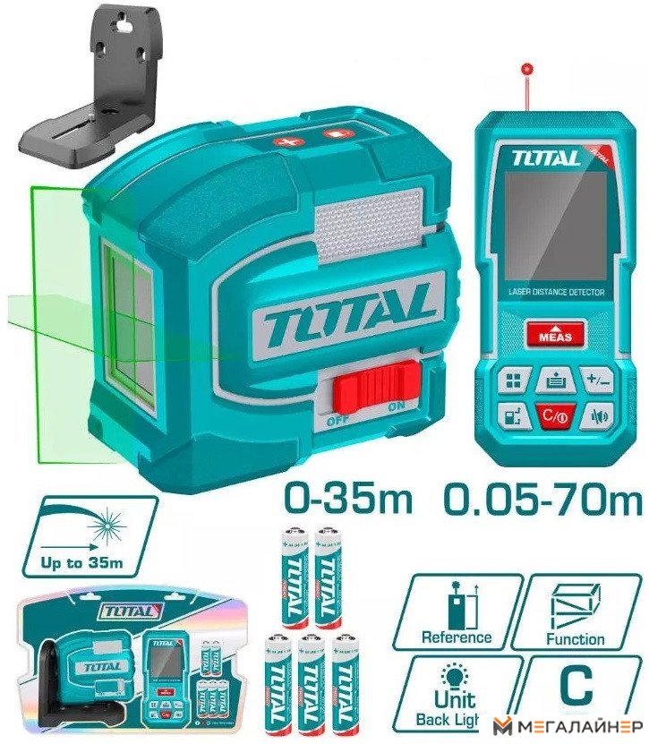 | Комплектация | - Самовыравнивающийся лазерный уровень с зеленым лучом (TLL156601) - 1 шт. - Лазерный дальномер (TMT57026) - 1 шт. - Батарейки LR6 AA (1,5 В) - 3 шт. - Батарейки AAA (1,5 В) - 2 шт. - Блистер |