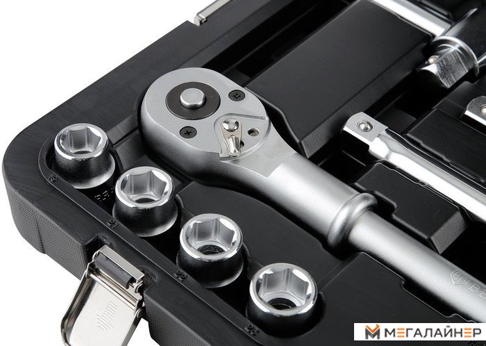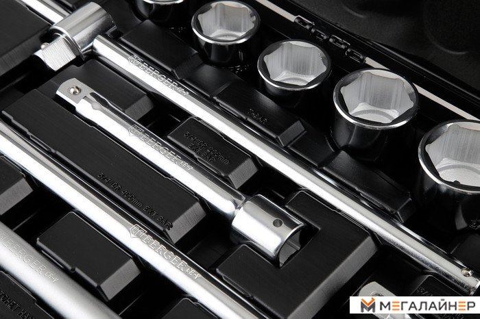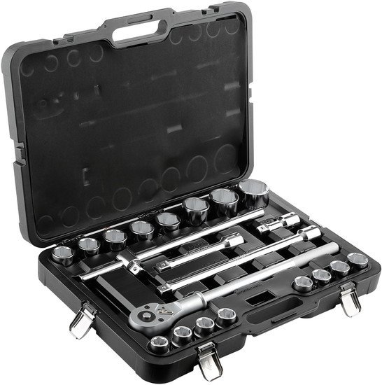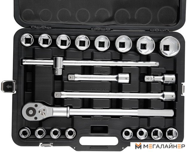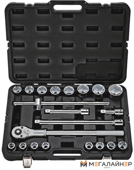 | Комплектация | - 16 шт: 3/4" Головки торцевые 6-гранные: 19, 21, 22, 23, 24, 26, 27, 29, 30, 32, 35, 36, 38, 41, 46, 50 мм- 1 шт: 3/4" Трещотка (ключ трещоточный с быстрым сбросом): 24 зуба, 500 мм- 3 шт: 3/4" Удлинитель: 100, 200, 400 мм- 1 шт: 3/4" Удлинитель со скользящим переходником: 450 мм |