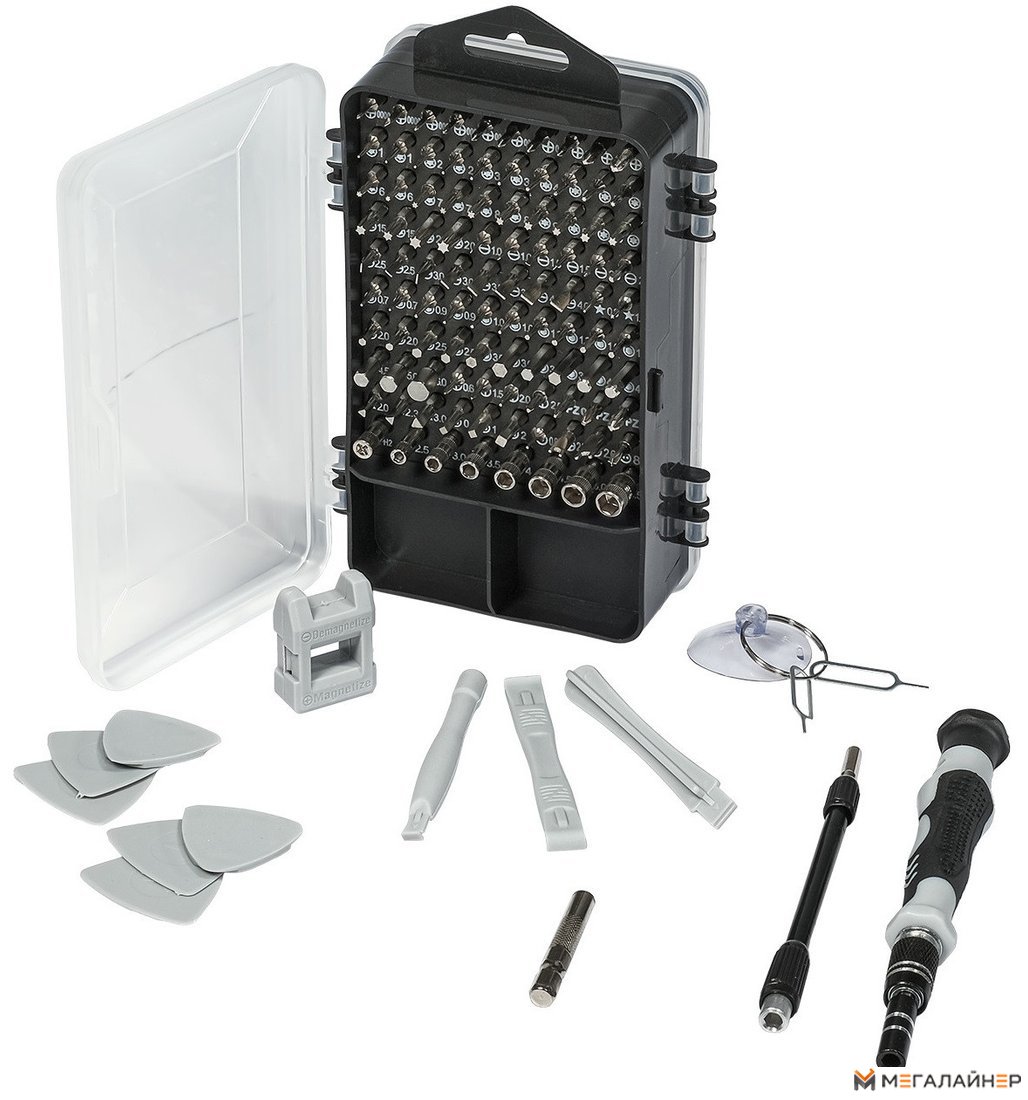 | Комплектация | - Отвертка-держатель для бит (1 шт) - Гибкий вал (1 шт) - Держатель для бит (1 шт) - Лопатка (3 шт) - Ключ для SIM карты (2 шт) - Магнит (1 шт) - Присоска (1 шт) - Медиатор (6 шт) - Биты 25 мм (98 шт) - Удлинитель для бит (1 шт) - Кейс (1 шт) |