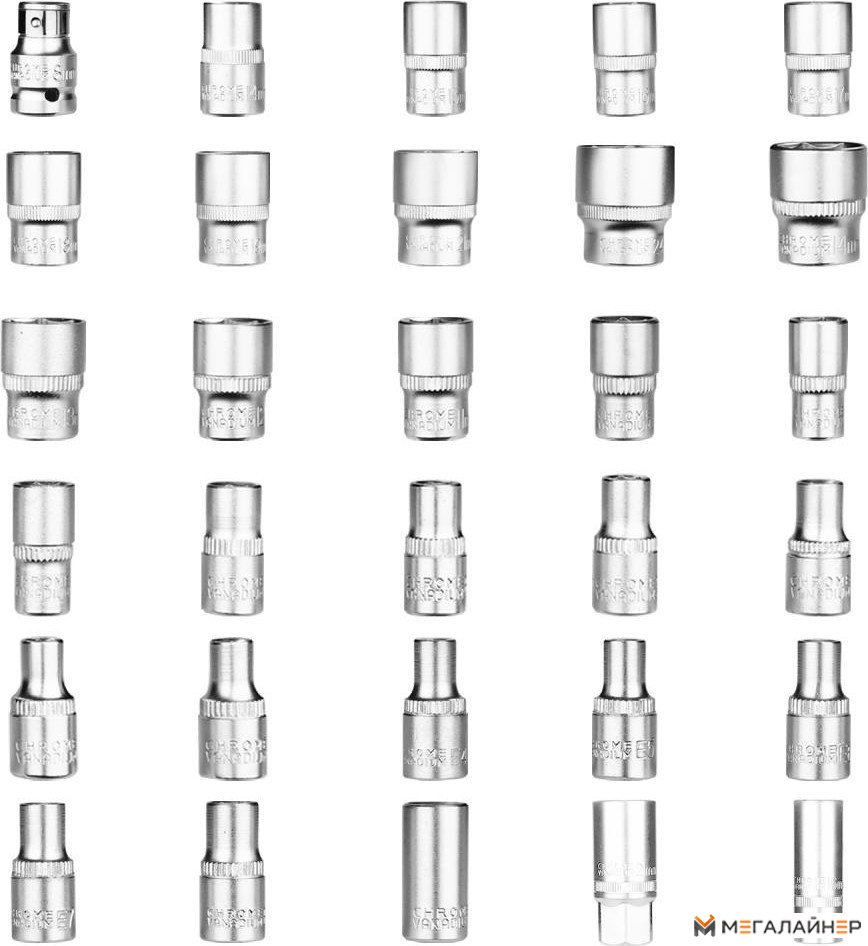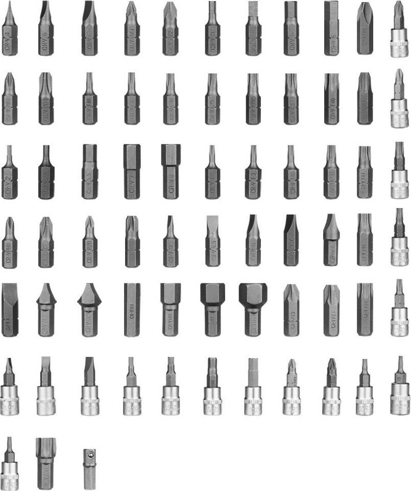 | Комплектация | Торцевые головки 1/4" - 18 шт. Метрические: 4, 4.5, 5, 5.5, 6, 7, 8, 9, 10, 11, 12, 13, 14 мм Дюймовые: E4, E5, E6, E7, E8 Торцевые головки 1/2" - 8 шт. Метрические: 14, 15, 16, 17, 18, 19, 21, 24 мм Отвертка-держатель - 1 шт. Шестигранные ключи - 3 шт. 1.5, 2, 2.5 мм Удлинители - 3 шт. 1/4" х 2" 1/4" х 4" 1/2" х 5" Т-образный вороток 1/4" - 1 шт. Гибкий удлинитель 1/4" - 1 шт. Удлинитель с адаптером для головок 1/2" - 1 шт. Биты 6.35 мм - 36 шт. TT: 10, 20 PZ: 0, 1, 2, 3 PH: 0, 1, 2, 3 SL: 3, 4, 5, 5.5, 6, 6.5, 7, 8 H: 2, 2.5, 3, 4, 5, 5.5, 6, 7, 8 T: 8, 9, 10, 15, 20, 25, 27, 30, 40 AD Биты 8 мм - 16 шт. T: 40, 45, 50, 55 H: 8, 10, 12, 14 SL: 8, 10, 12 PH: 3, 4 PZ: 3, 4 Карданный шарнир - 2 шт. 1/4", 1/2" Биты-головки - 17 шт. PH: 1, 2 PZ: 1, 2 H: 3, 4, 5, 6 SL: 4, 5.5, 7 T: 8, 10, 15, 20, 25, 30 Трещотки - 2 шт. 1/4", 1/2" Свечные головки - 2 шт. 1/2" х 16 мм 1/2" х 21 мм Держатели для бит - 2 шт. 1/4", 1/2" Кейс - 1 шт. |