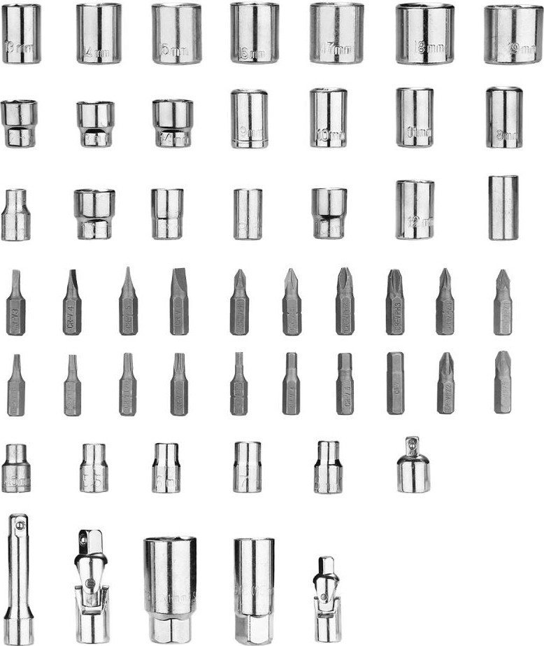 | Комплектация | Комбинированные ключи: 6, 7, 8, 9, 10, 11, 12, 13, 14, 15 мм - 10 шт. Ключи шестигранные: 1.5, 2, 2.5, 3, 3.5, 4, 5, 6 мм - 8 шт. Зажимные клещи 175 мм - 1 шт. Уровень 250 мм - 1 шт. Изолента 5м - 1 шт. Ножницы 200 мм - 1 шт. Инструмент для зачистки проводов 200 мм - 1 шт. Строительный нож 18 мм - 1 шт . Набор метизов по дереву (76 шт) - 1 шт. Рулетка 5м - 1 шт. Кусачки 150 мм - 1 шт. Отвертки (SL) 6х38, 4х75, 5х75, 6х100 мм - 4 шт. Отвертки крестовые (PH) 2х38, 1х75, 2х100 мм - 3 шт. Ключ Торкс (T) Т10, 15, 20, 25, 27, 30, 40 - 7 шт. Молоток - 1 шт. Длинногубцы 160 мм - 1 шт. Плоскогубцы 160 мм - 1 шт. Бокорезы 150 мм - 1 шт. Переставной ключ 225 мм - 1 шт. Держатель для бит 6.35мм - 1 шт. Струбцина быстрозажимная 100 мм - 2 шт. Отвертки прецизионные (SL 2.4, 3.0; PH 00, 0) - 4 шт. Головки 6.35 мм: 4, 4.5, 5, 5.5, 6, 7, 8, 9, 10, 11, 12, 13, 14 мм - 13 шт. Головки 3/8": 6, 7, 8, 9, 10, 11, 12, 13, 14, 15, 16, 17 мм - 12 шт. Головка 6.35 мм - 1 шт. Головки свечные 10 мм.: 16, 21 мм - 2 шт. Шарнир карданный 6.35: 10 мм - 1 шт. Т-образная отвертка для бит 6.35 мм - 1 шт. Удлинитель торцевых головок 10*75 мм - 1 шт. Удлинитель гибкий 6.35*160 мм - 1 шт. Поворотный адаптер для головок 6.35*10 мм - 1 шт. Биты 25 мм: H3, 4,5, 6: PH0, 1, 2, 3; PZ0, 1, 2, 3; SL3, 4, 5, 6; T10, 15, 20, 25 - 20 шт. Ключ Торкс 5 мм, 6 мм - 2 шт. Трещотки - 2 шт. Манометр автомобильный - 1 шт. Отвертка для бит с трещоткой - 1 шт. Кейс - 1 шт. |