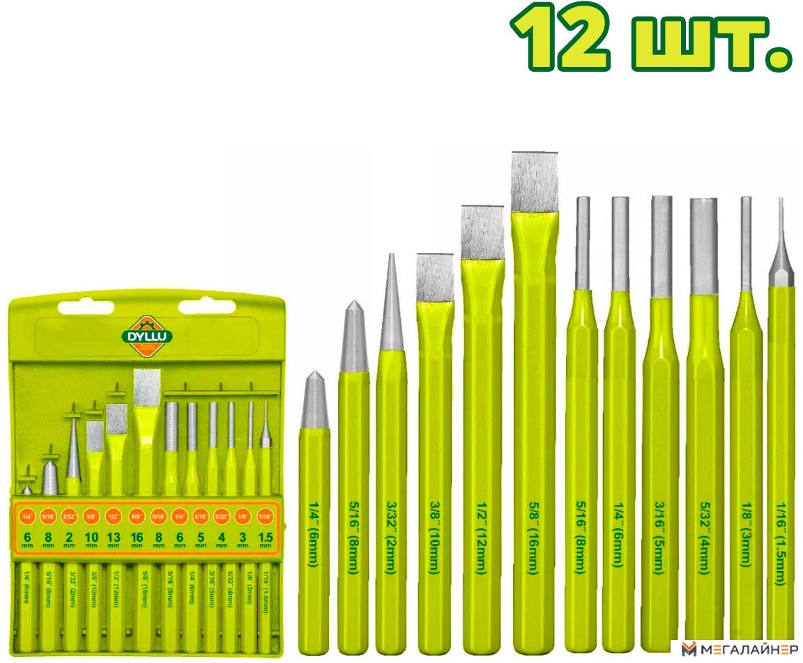 | Комплектация | Выколотки (1,5 мм, 3 мм, 4 мм, 5 мм, 6 мм, 8 мм) - 6 шт. Зубила (10 мм, 12 мм, 16 мм) - 3 шт. Бородок (2 мм) - 1 шт. Керны (6 мм, 8 мм) - 2 шт. Длина, мм 115-172 |