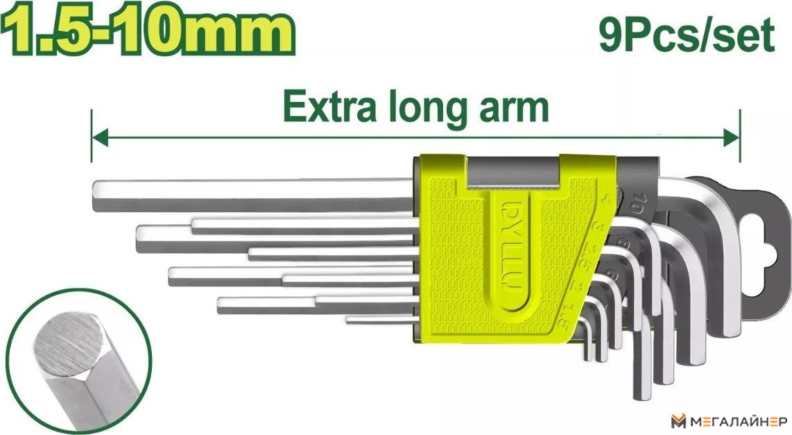 | Комплектация | набор ключей шестигранных удлиненных 1,5-10мм - 9шт.; пластиковый держатель для хранения; блистер |