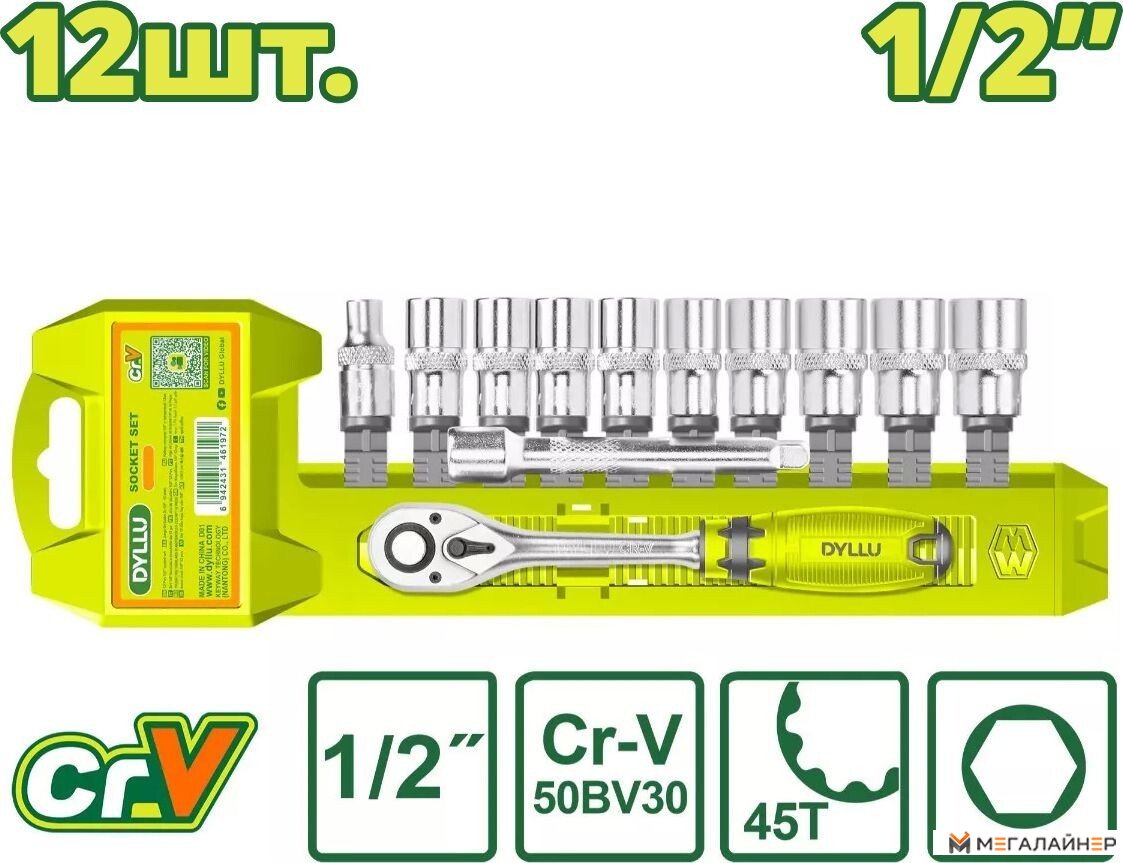| Комплектация | Трещотка 45T 1/2" - 1 шт. Торцевые головоки 3/8" (10, 11, 12, 13, 14, 15, 17, 19, 21, 24 мм) - 10 шт. Удлинитель 1/2" (75 мм) - 1 шт. Пластиковый подвес для хранения |