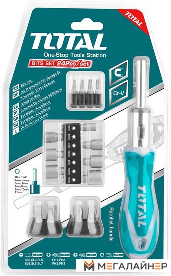| Комплектация | Отвертка-держатель бит с набором бит и торцевых головок TOTAL TACSD30246 (24 предмета): Биты 6,35x25мм - 16 шт. SL3, SL4, SL5, SL6, SL6, SL7, PH1, PH2, PH2, PH3, PZ1, PZ2, T10, T15, T20, T25 Торцевые головки 1/4" - 7шт. 5мм, 6мм, 7мм, 8мм, 9мм, 10мм, 11мм Реверсивная рукоятка держатель - 1 шт. Блистер |