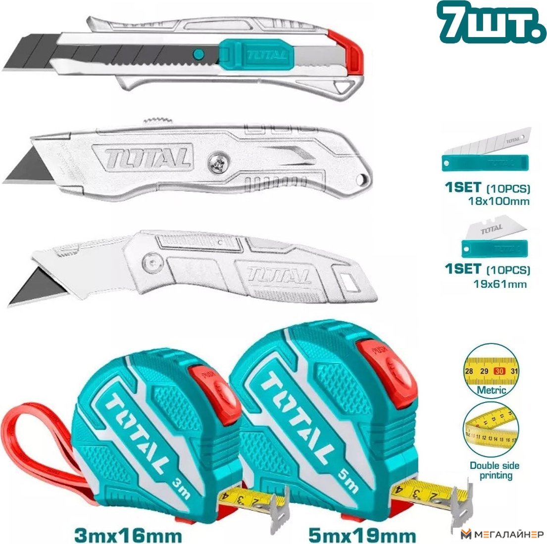 | Комплектация | Нож алюминиевый с сегментным лезвием 18 мм – 1 шт. Универсальный алюминиевый нож с трапециевидным лезвием – 1 шт. Складной алюминиевый нож с трапециевидным лезвием – 1 шт. Рулетка 3 м x 16 мм – 1 шт. Рулетка 5 м x 19 мм – 1 шт. Набор сменных сегментных лезвий 18 x 100 мм – 10 шт. Набор сменных трапециевидных лезвий 61 x 19 мм – 10 шт. Блистер |