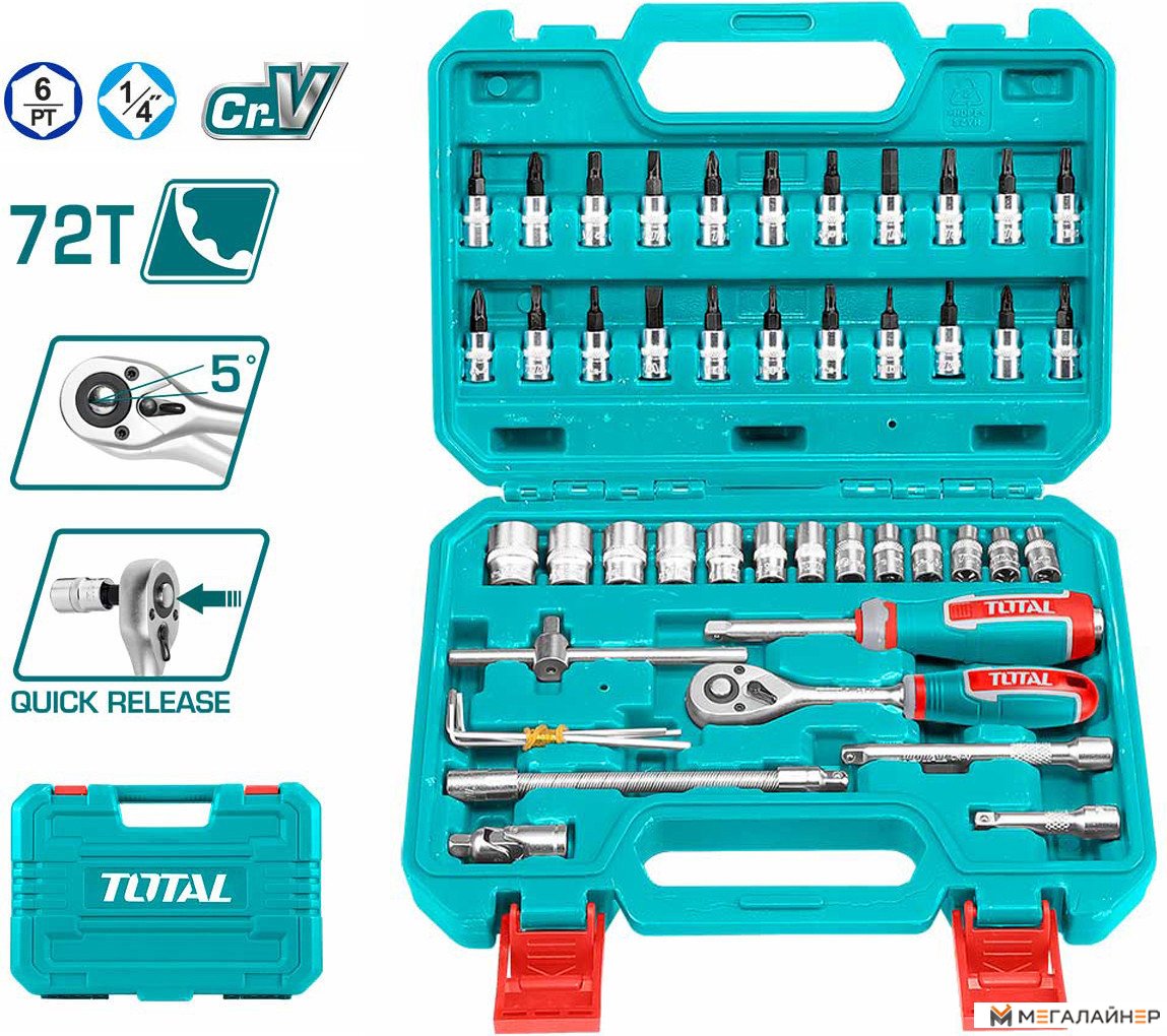| Комплектация | - Трещотка 1/4" 72T - 1 шт. - Торцевые головки 1/4" (4; 4,5; 5; 5,5; 6; 7; 8; 9; 10; 11; 12; 13; 14 мм)- 13 шт. - Универсальный шарнир 1/4" - 1 шт. - Удлинители 1/4" (50 мм; 100 мм) - 2 шт. - Вороток-отвертка 1/4" 150 мм - 1 шт. - Биты (PH1, PH2, PH3, PZ1, PZ2, PZ3, SL4, SL5.5, SL6.5, H3, H4, H5, H6, H7, H8, T8, T10, T15, T20, T25, T30, T40) - 22 шт. - Гибкий удлинитель 1/4" 150 мм - 1 шт. - Вороток T-образный с бегунком 1/4" 114 мм - 1 шт. - Шестигранный ключей (1,5; 2; 2,5; 3 мм) - 4 шт. |