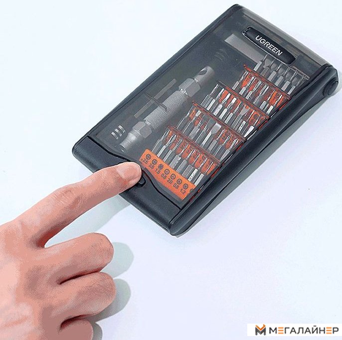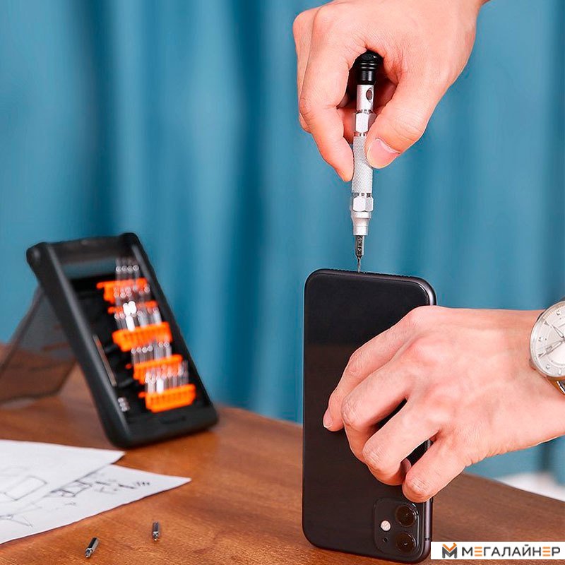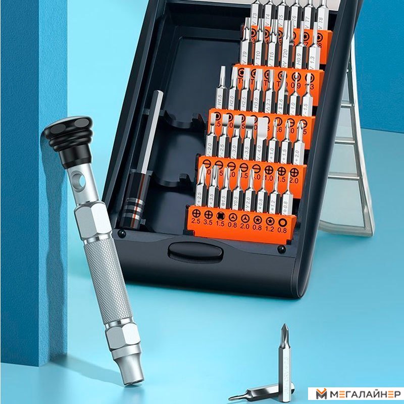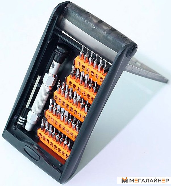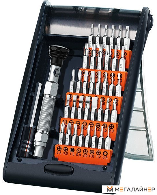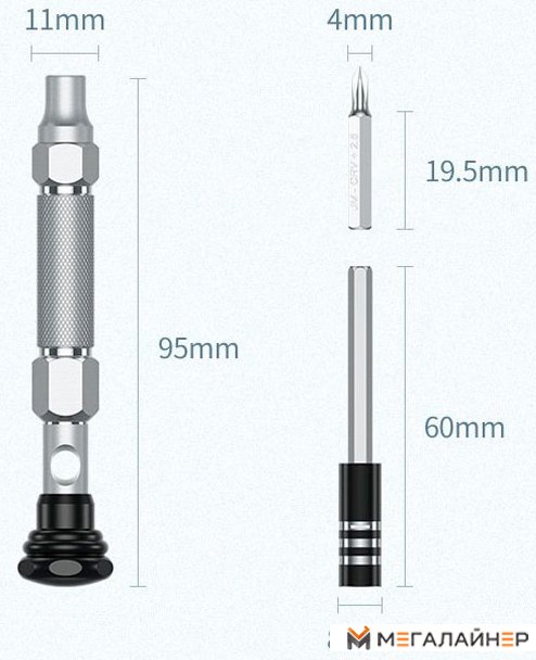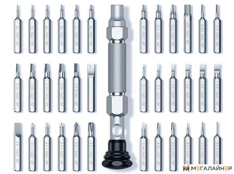 | Комплектация | Магнитный удлинитель - 60мм; Отвертка под биты; Phillips - 1.0, 1.5, 2.0, 2.5, 3.5; Flathead - 1.0, 1.5, 2.0, 2.5, 3.0, 3.5, 4.0; Pentalobe - 0.8, 1.2; Torx - T3 - T10 + T15, T20; Tri-wing - 0.8, 2.0; Spanner - 1.6; Star - 0.8, 1.2 ; Pozidriv - Y0.8, Y2.0. |