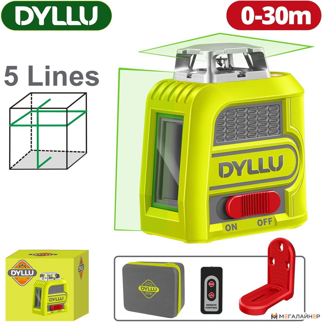 - Самовыравнивающийся линейный лазер – 1 шт.; - Пульт дистанционного управления – 1 шт.; - Магнитный кронштейн – 1 шт.; - Сумка из ткани; - Коробка