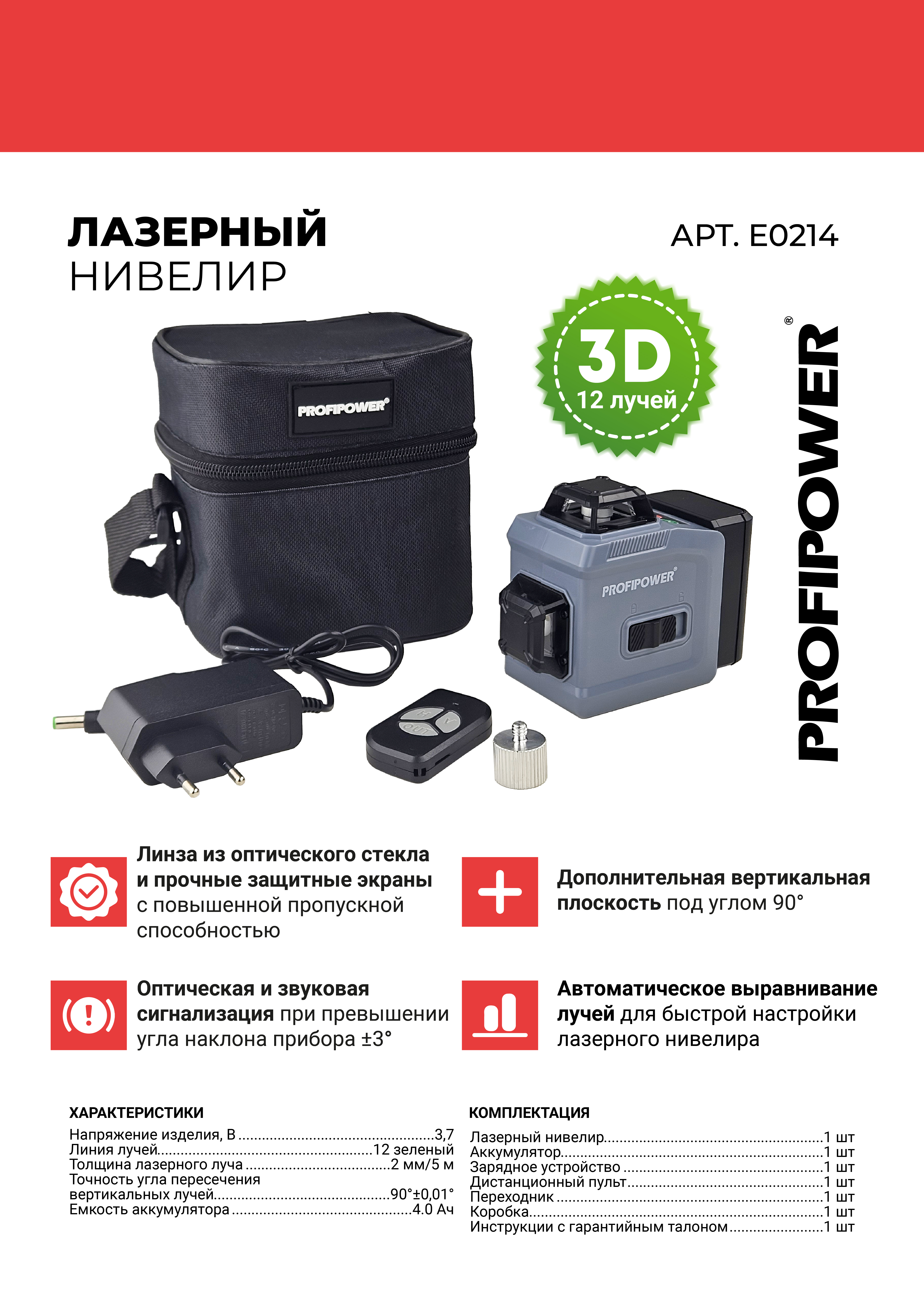 | Информация | ??Текст описания составлен при помощи искусственного интеллекта. - Лазерный нивелир Profipower NL-12G обеспечивает точность до 4 мм на 10 м, что делает его идеальным инструментом для строительных и отделочных работ. - С помощью этого нивелира можно строить прямые линии, крестовые линии и круговые линии, что позволяет выполнять различные задачи с высокой точностью. - Дальность работы с приёмником составляет до 30 м, что обеспечивает широкий охват рабочей зоны. - Класс защиты корпуса IP54 гарантирует надежную защиту от пыли и брызг воды, что делает нивелир надежным в различных условиях. - Резьба под штатив 5/8" обеспечивает удобство использования на различных поверхностях и позволяет надежно закрепить нивелир для точной работы. - Дистанционное управление при помощи пульта позволяет управлять нивелиром из удобного для вас места, что упрощает работу. - Тип призменный обеспечивает четкое и яркое отображение лазерных линий для удобной работы в различных условиях освещения. - Все эти характеристики делают Лазерный нивелир Profipower NL-12G незаменимым инструментом для профессиональных строителей и ремонтников. |