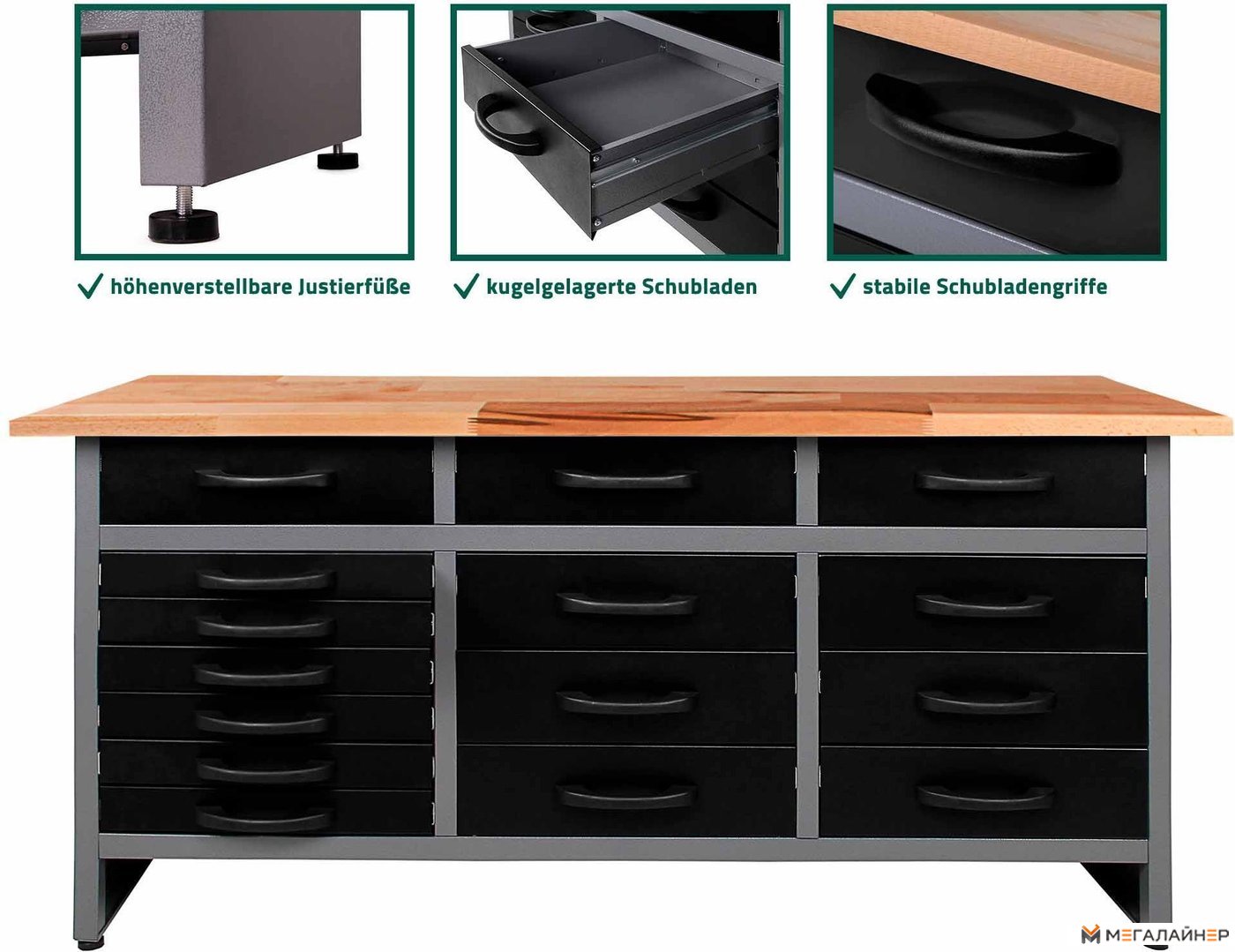 | Информация | Те, у кого самые высокие требования к рабочему столу, не могут обойти этот верстак стороной. Вы когда-нибудь хотели построить что-нибудь более крупное, например, домик на дереве для своих детей? Ваше предыдущее рабочее место было слишком маленьким? Вы не могли отделить свой инструмент от остальных принадлежностей, потому что у вас не было достаточного количества отделений? Этот стол позволяет справиться с этими проблемами! Этот верстак оснащен чрезвычайно прочной столешницей под цвет бука, имеющей длину 160 см, что позволяет выполнять крупномасштабные работы. Под деревянной панелью находятся 15 выдвижных ящиков (каждый с грузоподъемностью до 20 кг) 2 разных размеров. Благодаря этому вы можете хранить самые разные инструменты, шурупы, гвозди и аксессуары, и ничто не испортится. При этом каждый отдельный выдвижной ящик легко открывается и закрывается благодаря шарикоподшипникам и направляющим. Серо-черный цвет рабочего стола при этом выглядит стильно и везде уместно. Специальный лак также обеспечивает устойчивость к царапинам и воздействию влаги. Рабочий стол имеет размеры 160 х 60 х 85 (В) см и может быть установлен практически в любом месте благодаря весу всего около 100 кг и регулируемым по высоте ножкам. Общая грузоподъемность верстака составляет около 450 кг. К этому верстаку также подходят другие верстаки с рабочей высотой 85 см, стенки с отверстиями для инструментов и шкафы для инструментов. |
