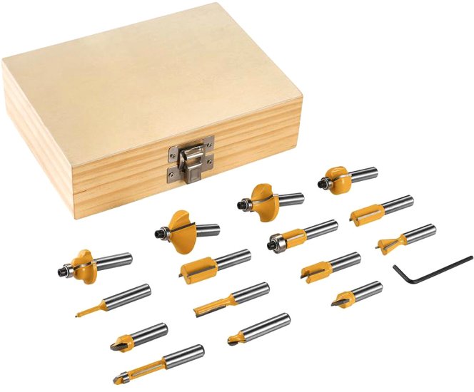 | Комплектация | Прямая пазовая 3,6,12,12.7,16мм - 5 шт Галтельная фреза R3.2мм, R6.3мм - 2 шт V-образная 90о 12.7мм - 1 шт Ласточкин хвост 12.7мм - 1 шт Панельная пилотная 6.3мм - 1 шт Обгонная 12.7мм - 1 шт Калевочная R9.5мм - 1 шт Кромочная 45о 32мм - 1 шт Пазовая R6.3мм - 1 шт Фасочная R4мм - 1 шт Шестигранный ключ 2,5мм - 1 шт Кейс |