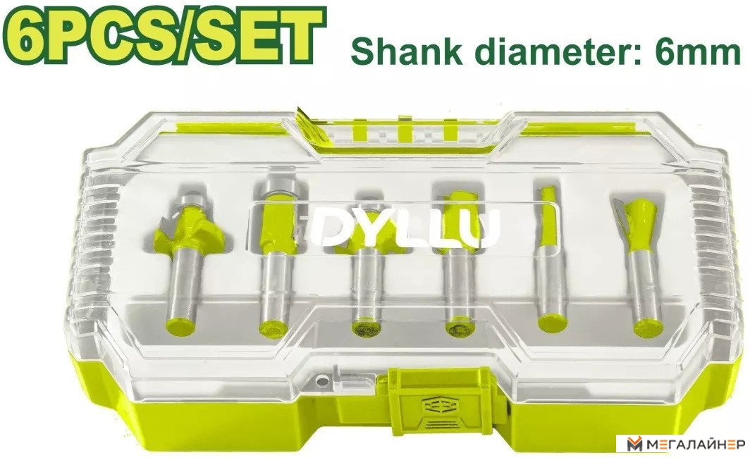 | Комплектация | - Корончатая фреза R-6,3 мм - 1 шт. - Прямая фреза 6 мм - 1 шт. - Угловая круглая фреза R-6,3 мм - 1 шт. - Плоская фреза 12,7 мм - 1 шт. - Прямая фреза 12 мм - 1 шт. - Фреза «ласточкин хвост» 12,7 мм - 1 шт. - Кейс |