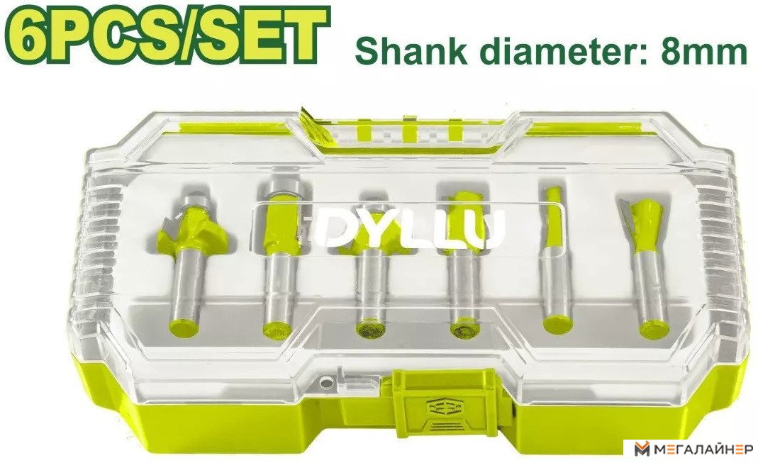 | Комплектация | - Корончатая фреза R-6,3 мм - 1 шт. - Прямая фреза 6 мм - 1 шт. - Угловая круглая фреза R-6,3 мм - 1 шт. - Плоская фреза 12,7 мм - 1 шт. - Прямая фреза 12 мм - 1 шт. - Фреза «ласточкин хвост» 12,7 мм - 1 шт. - Кейс |
