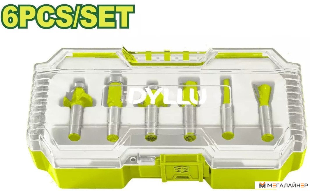 | Комплектация | - Корончатая фреза R-6,3 мм - 1 шт. - Прямая фреза 6 мм - 1 шт. - Угловая круглая фреза R-6,3 мм - 1 шт. - Плоская фреза 12,7 мм - 1 шт. - Прямая фреза 12 мм - 1 шт. - Фреза «ласточкин хвост» 12,7 мм - 1 шт. - Кейс |