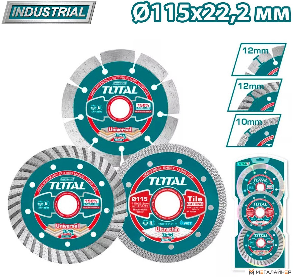 | Информация | - Алмазный диск для сухой резки 115x12 мм - 1 шт. - Алмазный высокоскоростной диск 115x12 мм - 1 шт. - Алмазный ультратонкий диск для резки плитки 115x10 мм - 1 шт. - Блистер - Обратите внимание на высокое качество и долговечность этих дисков! |