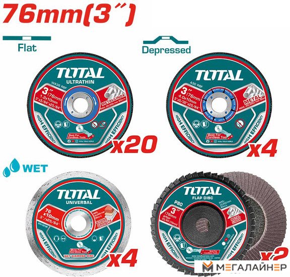 | Информация | Набор отрезных дисков Total TAC97630 включает в себя 20 штук дисков для резки металла толщиной 1,2 мм, 4 штуки металлических шлифовальных дисков толщиной 4,0 мм, 4 штуки дисков для мокрой резки толщиной 7 мм и 2 штуки лепестковых кругов с зернистостью P80. |