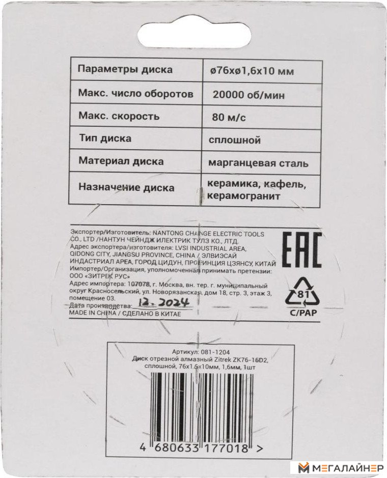 | Информация | Диск отрезной алмазный сплошной Zitrek ZK76-16D2, 76x1,6x10мм, 1,6мм предназначен для использования с УШМ при отрезных работах по керамике, кафелю и керамограниту. |