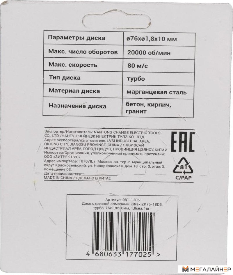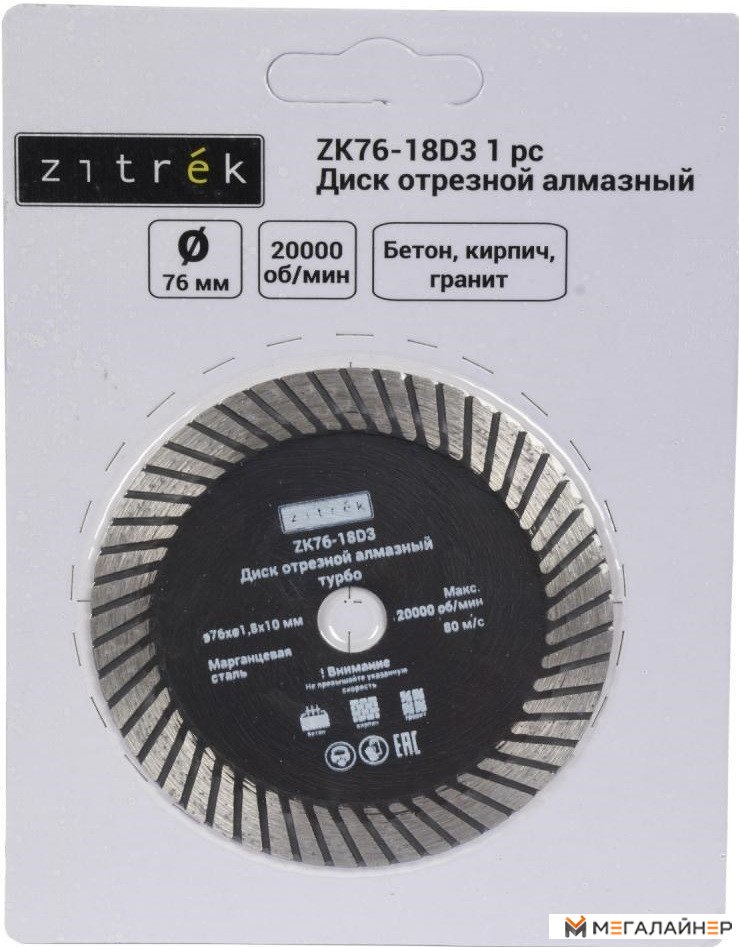 | Информация | Диск отрезной алмазный турбо Zitrek ZK76-18D3, 76x1,8x10мм, 1,8мм предназначен для использования с УШМ при отрезных работах по бетону, кирпичу и граниту. |