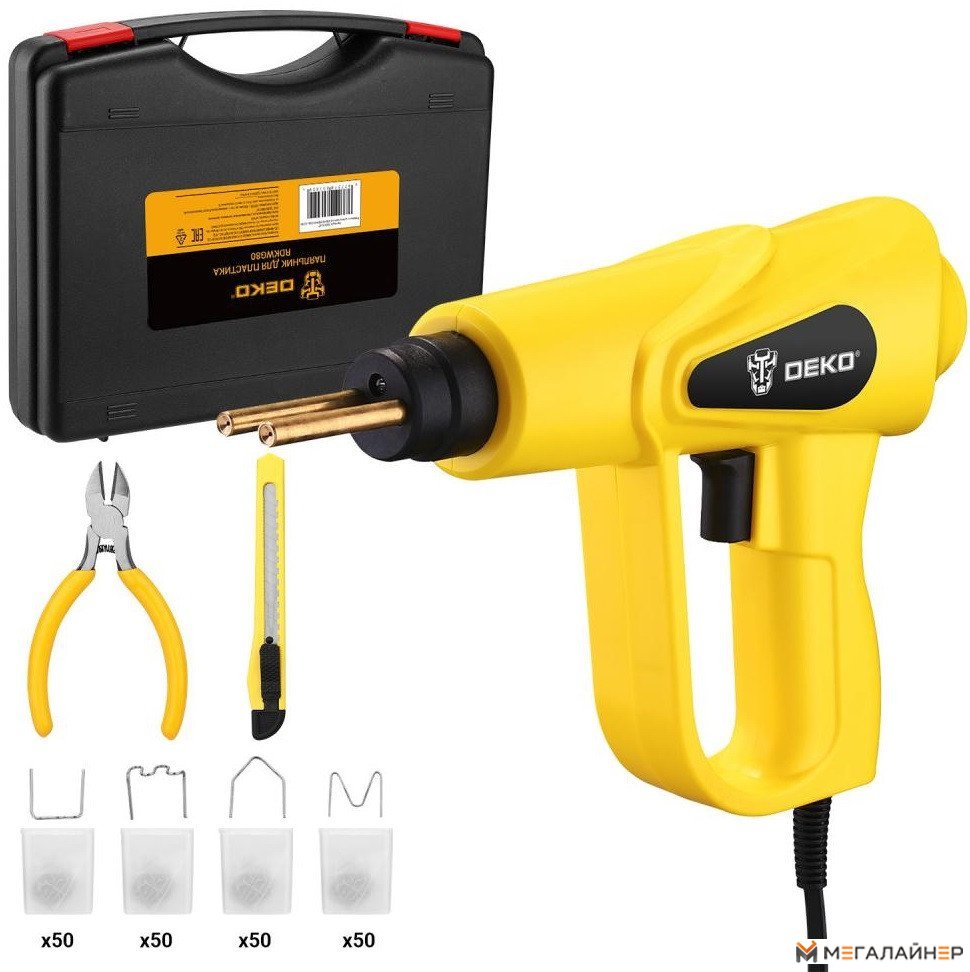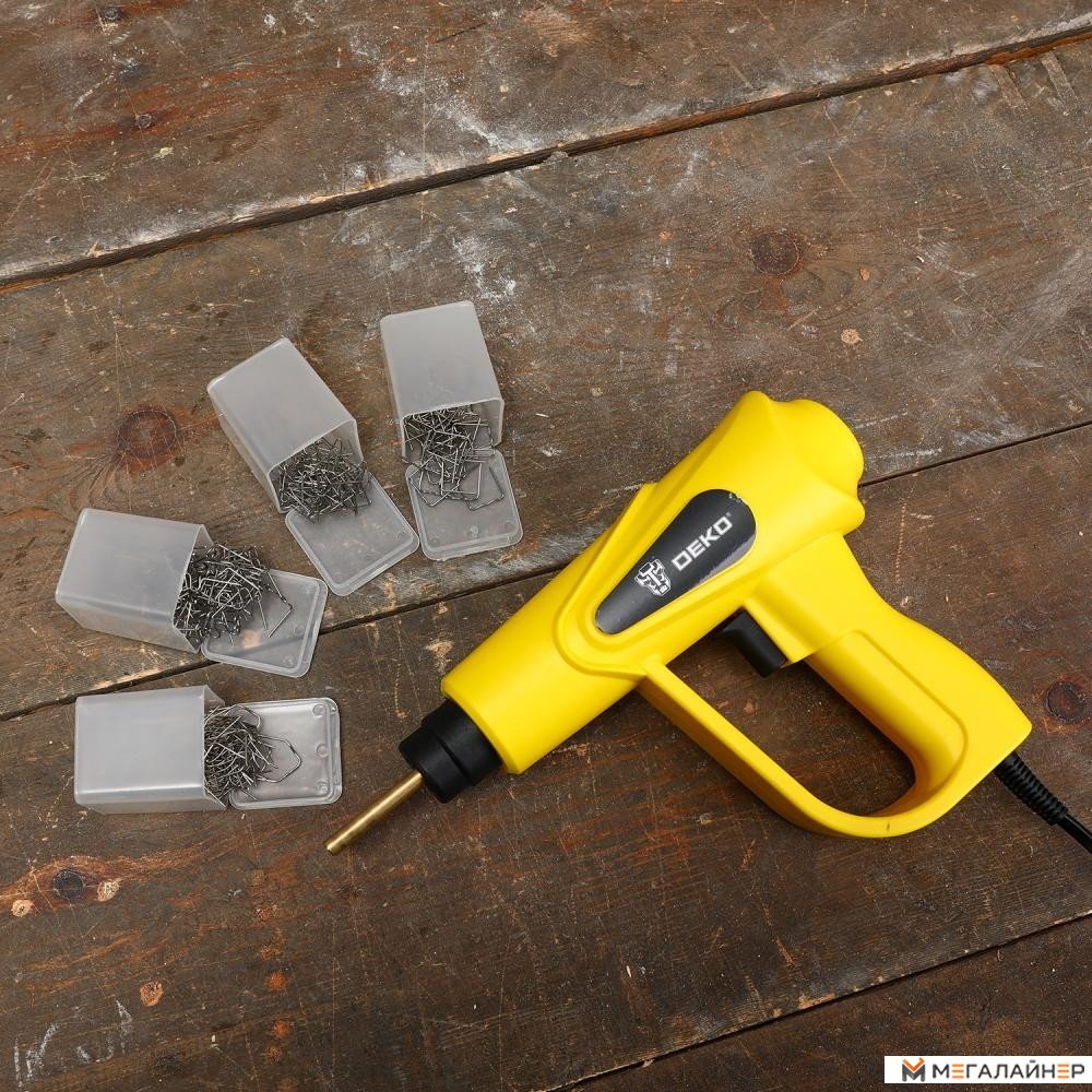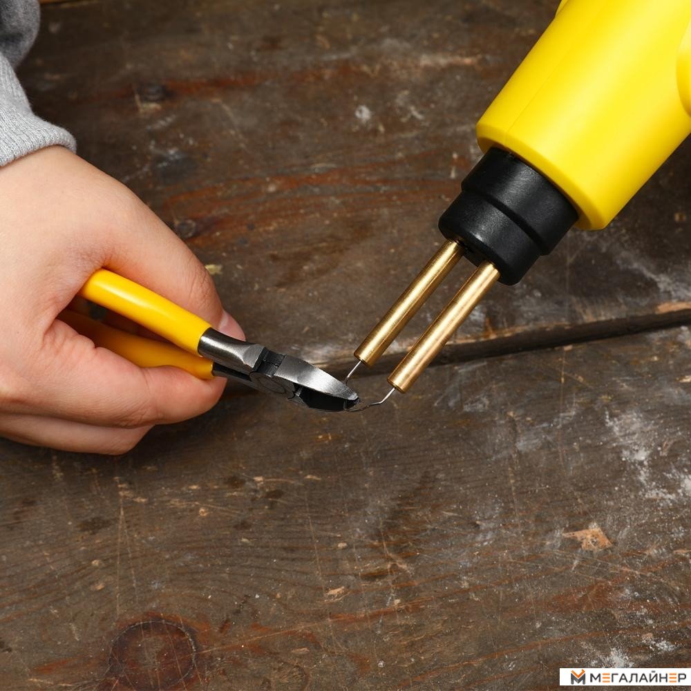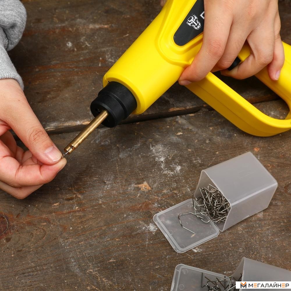 - Паяльник - 1 шт.; - Кусачки - 1 шт.; - Канцелярский нож - 1 шт.; - Плоские скобы ?0,8мм - 50 шт.; - Внешние угловые скобы ?0,6мм - 50 шт.; - Внутренние угловые скобы ?0,8мм - 50 шт.; - Изогнутые скобы ?0,8мм - 50 шт.; - Руков